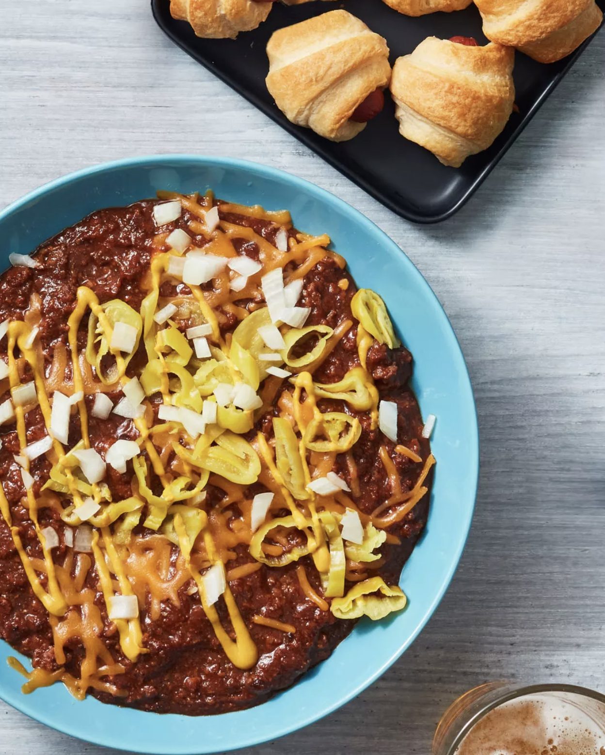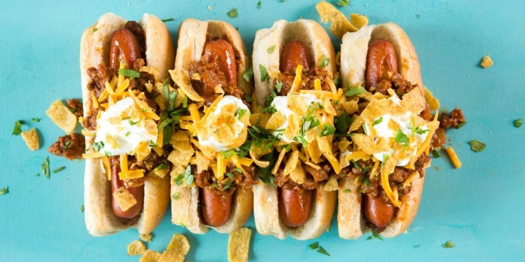 You’ve probably had a “walking taco” or “taco in a bag” a time or two at a tailgate. Here’s a fun way to enjoy those classic flavors on a dog. Use our chili base, or make your own. Smear a scoop on top of your hot dog, and add crispy corn chips, sharp cheddar cheese, and cooling sour cream. With a pot of chili nearby, you’ve also given your guests an option of several foods, and that’s an easy win-win when time and cooking space are limited.