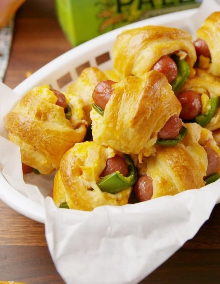 Cut hot dogs in half and place each half into jalapeños and place on the thick end of crescent triangle and role them up. Brush with egg wash and bake until golden, 15-20 minutes. Serve.