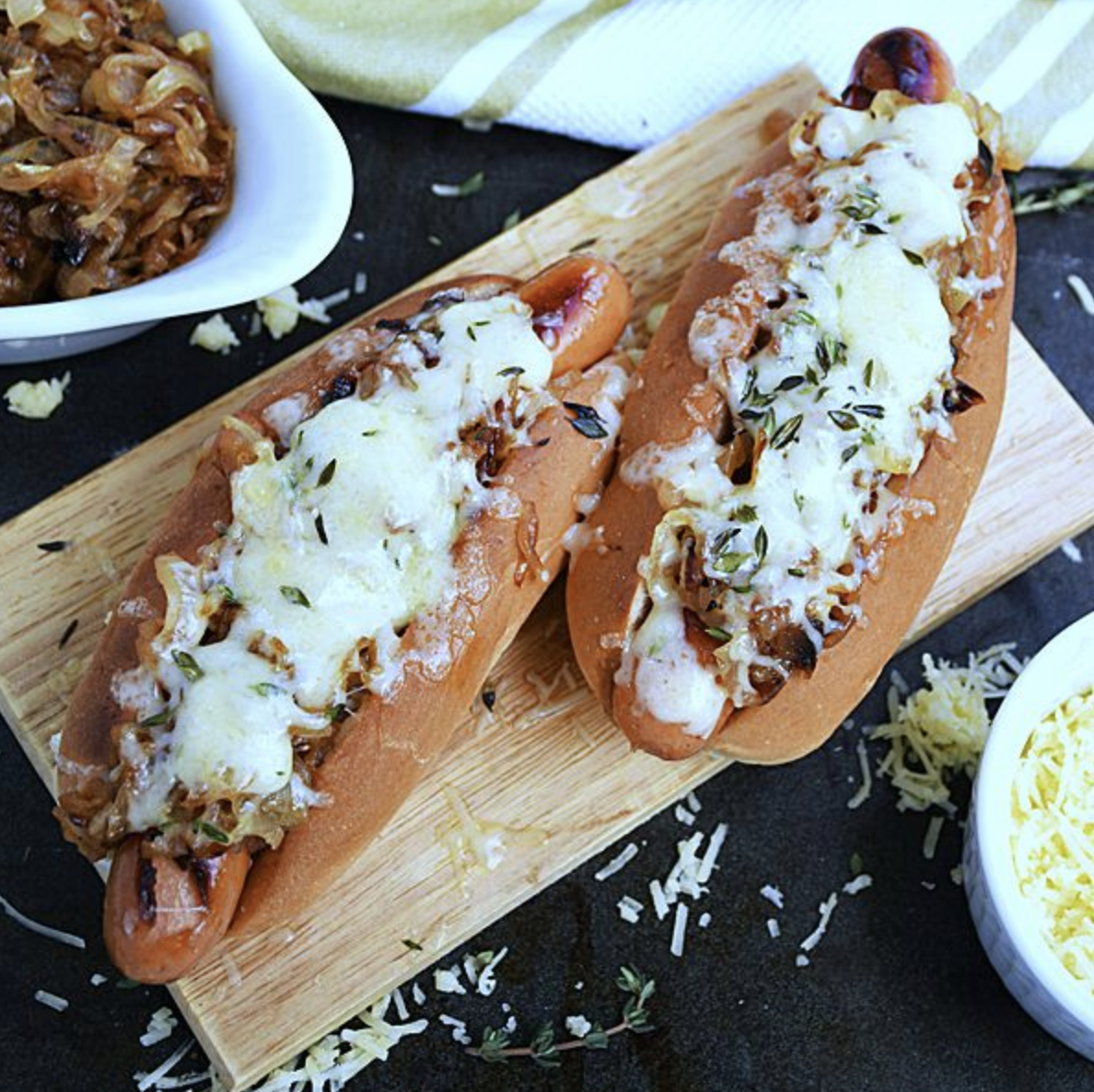 Top each bun with a hot dog, and a generous heaping of caramelized onions. Be sure to divide the onions evenly among the hot dogs you are making.