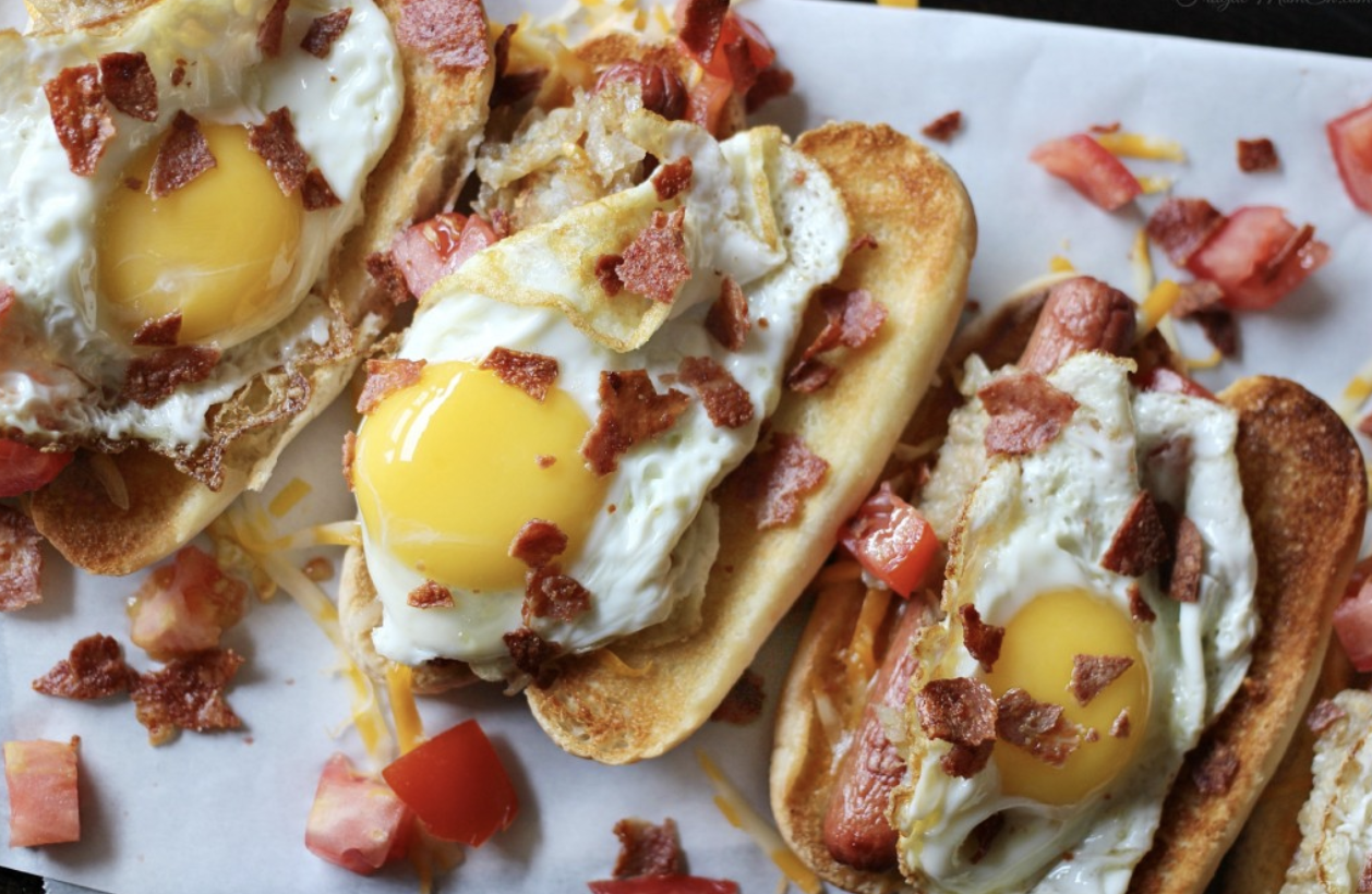 To assemble, sprinkle shredded cheese over toasted hot dog bun and top with cooked hotdog. Top with hash browned potato, sprinkle on the chopped tomato then lay on top of that one egg per hot dog, and crumbled bacon.