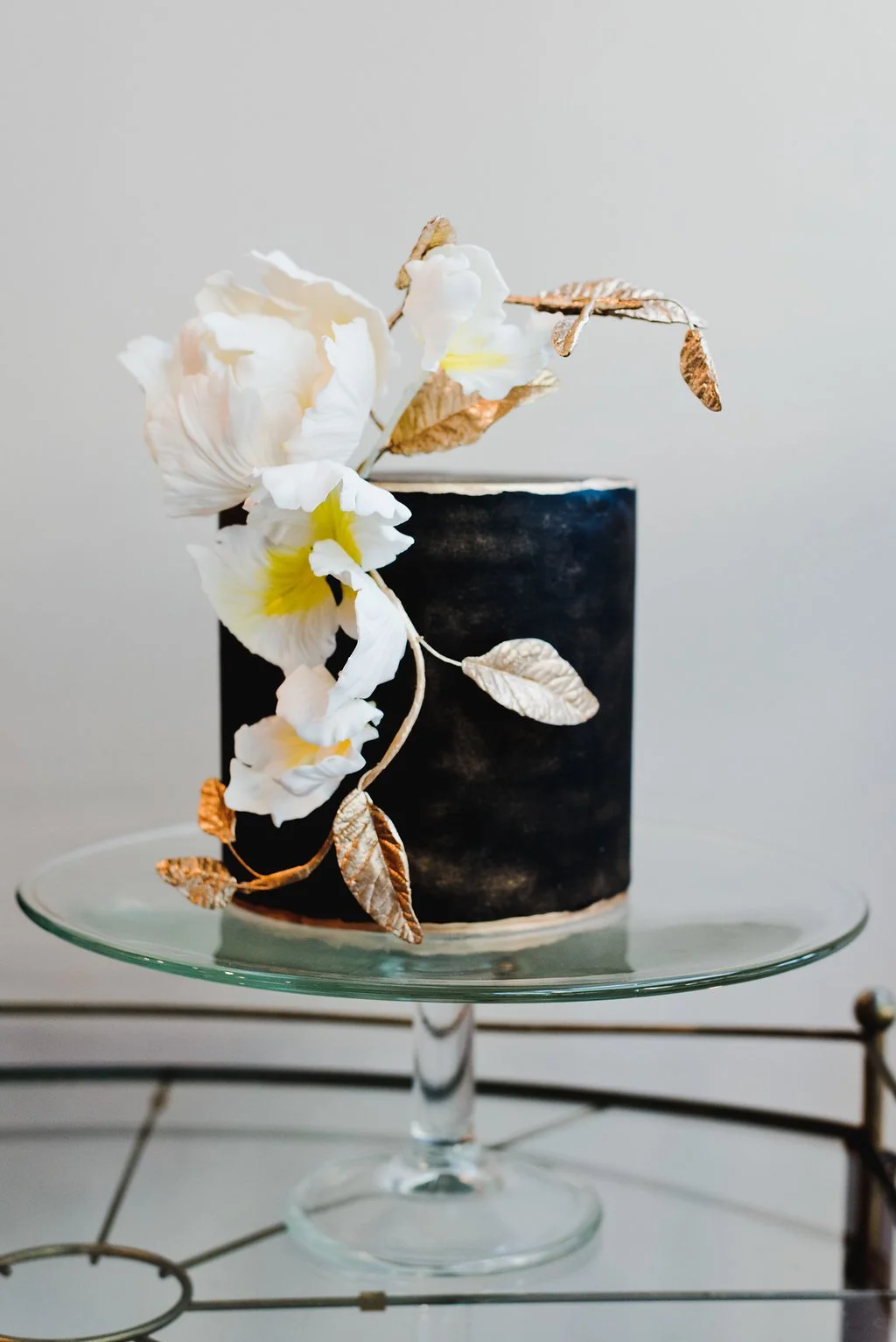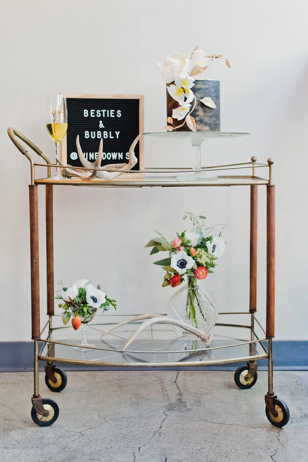 Then came the cake! Rachel (owner of Bay Cakes Design) came up with a perfect mini cake to round out the party. I knew I wanted black and I have admired her work for a while now, but she blew me out of the water with the detail she added with the sugar flowers on top of it. Sitting it on top of Lost + Found Vintage's bar cart with my felt board was one of the most inviting vignettes of this shoot.