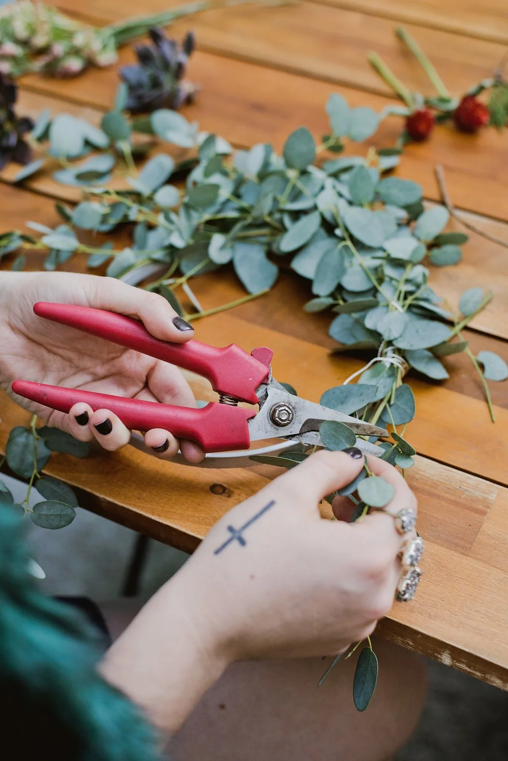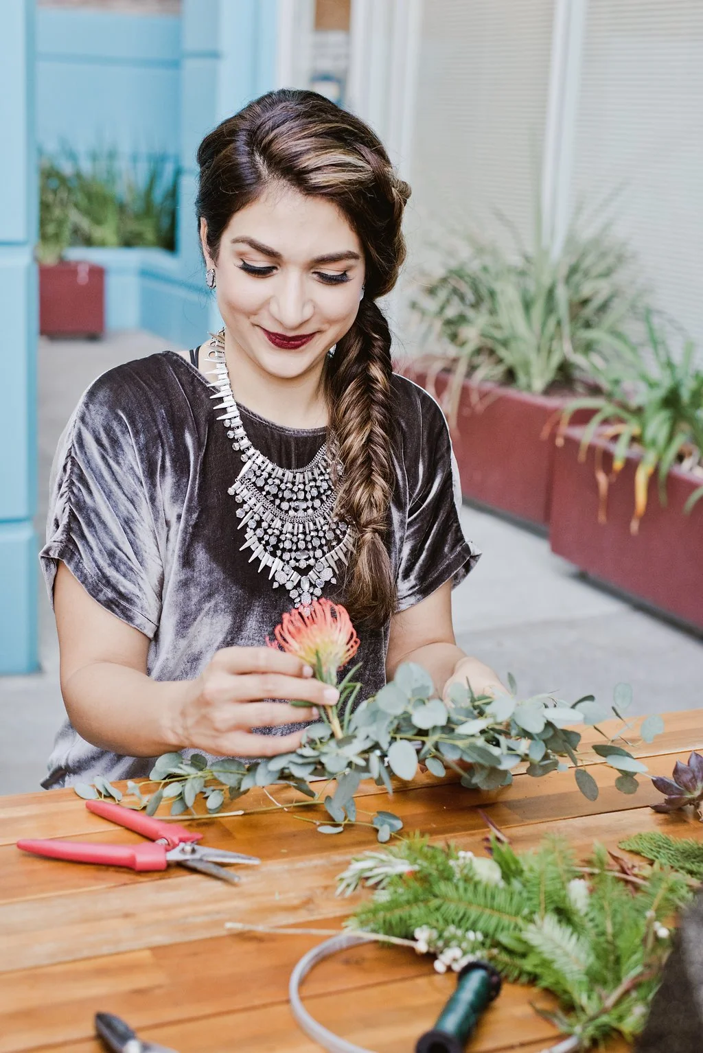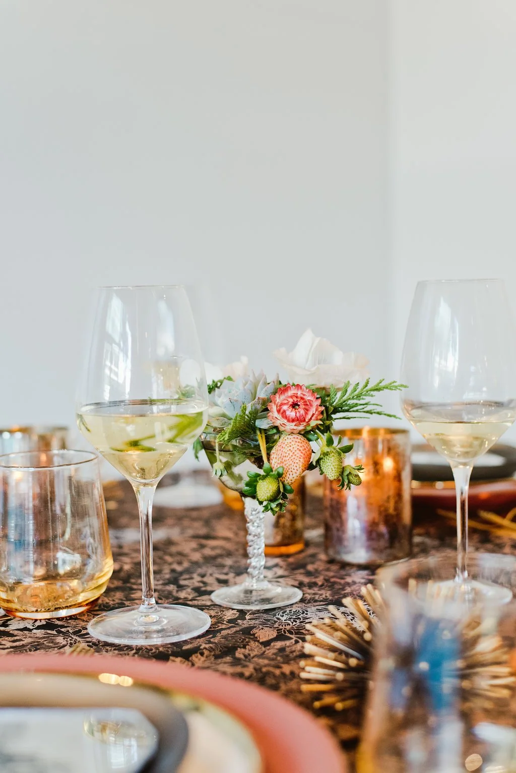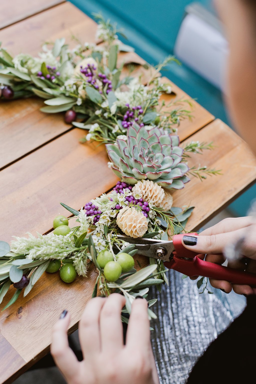 ProTip: always incorporate some type of interactive activity for the guests. In this case, I wanted it to be DIY-related. I've worked with the amazing Keegan (owner of Petal Atelier) for over a year now, collaborating on different projects, and she knew exactly the route I was wanting to go down. She suggested a DIY floral wreath station. I wanted the aesthetic to be neutral enough where it didn't scream Christmas at you, so we went with very earthy florals and greenery for these wreaths. The girls had an amazing time using the tools and creating some fun wreaths to take home. PS: How stunning are those bigger bouquets with strawberries, pomegranates, and anemones?! We were jaw dropped at their beauty.
