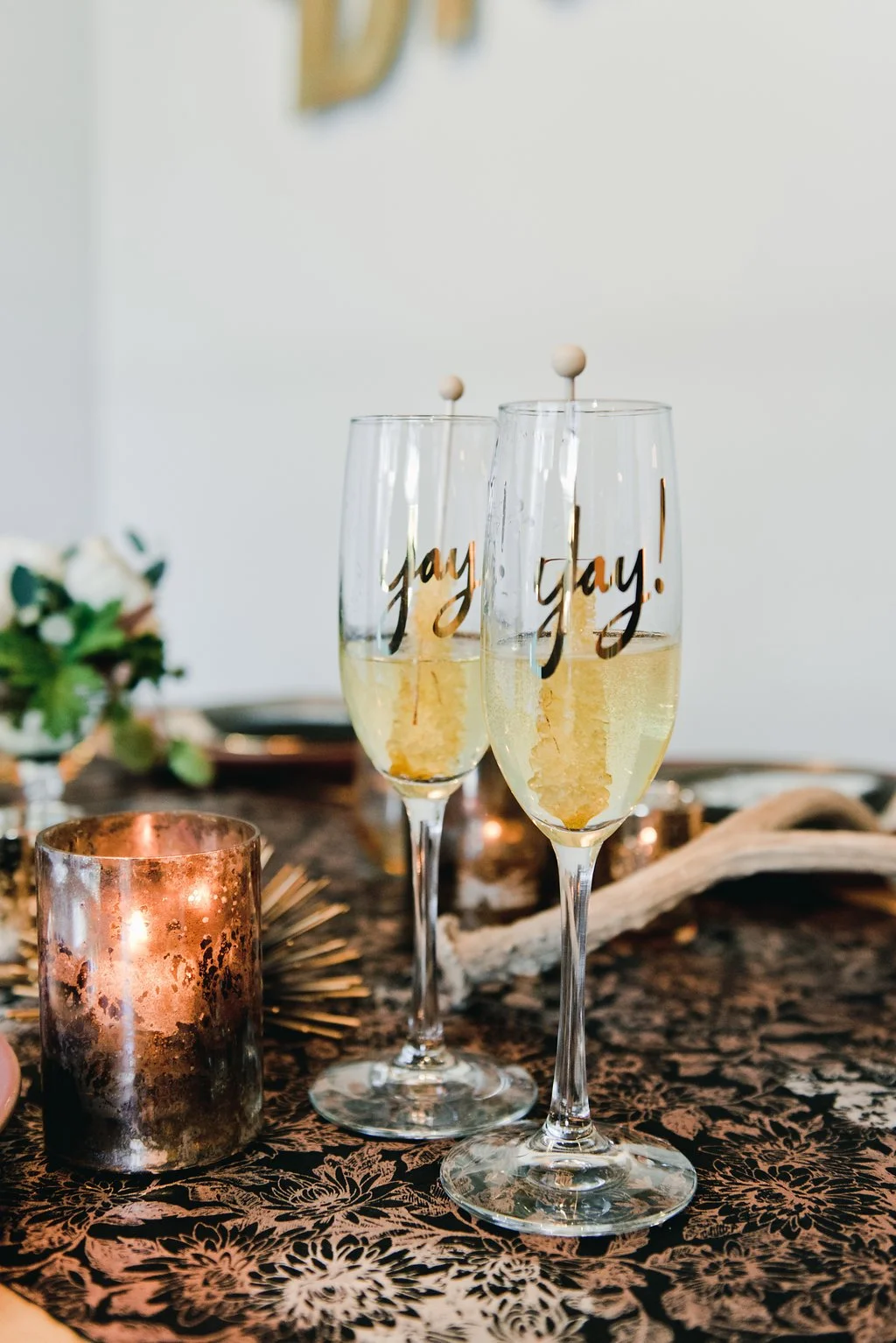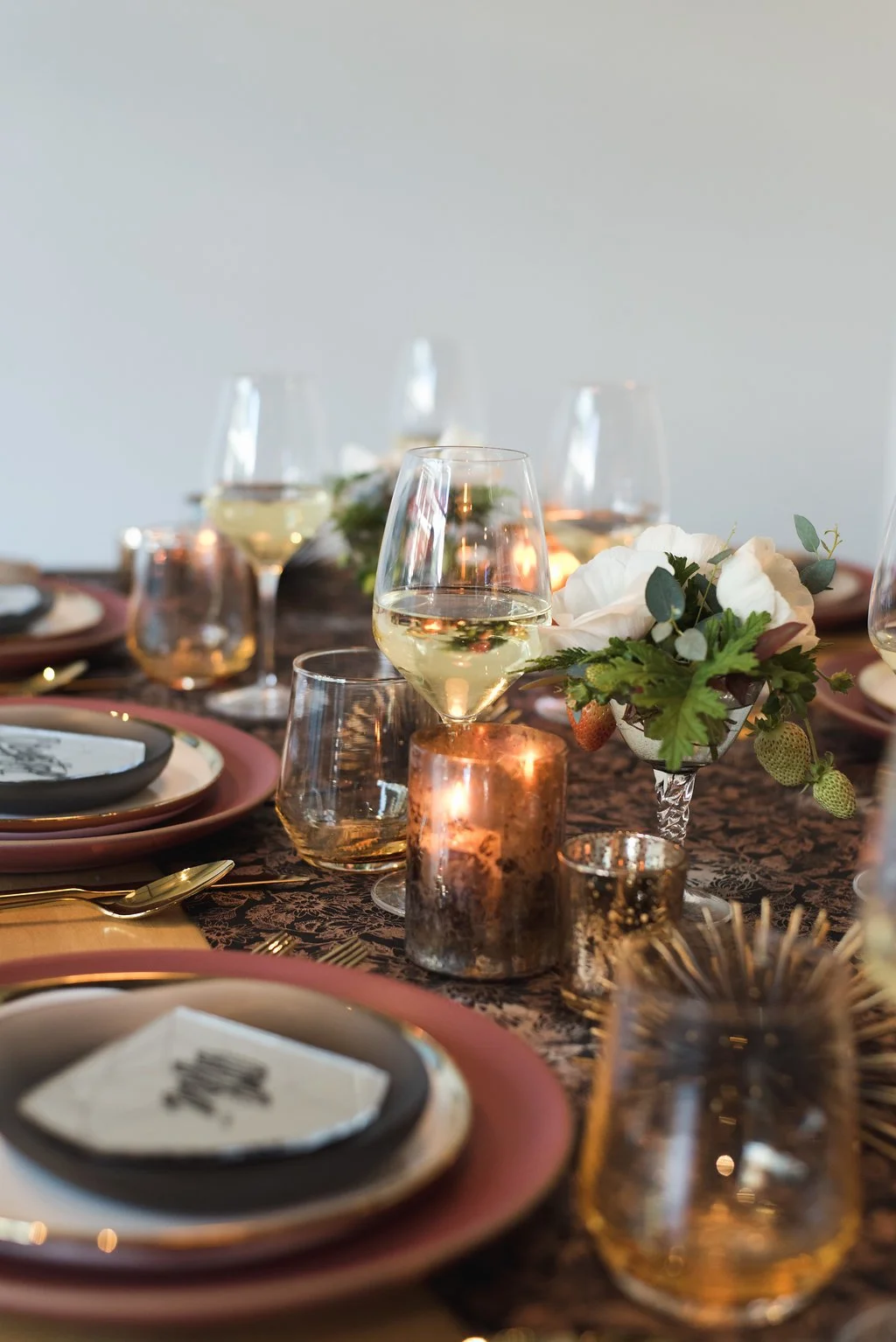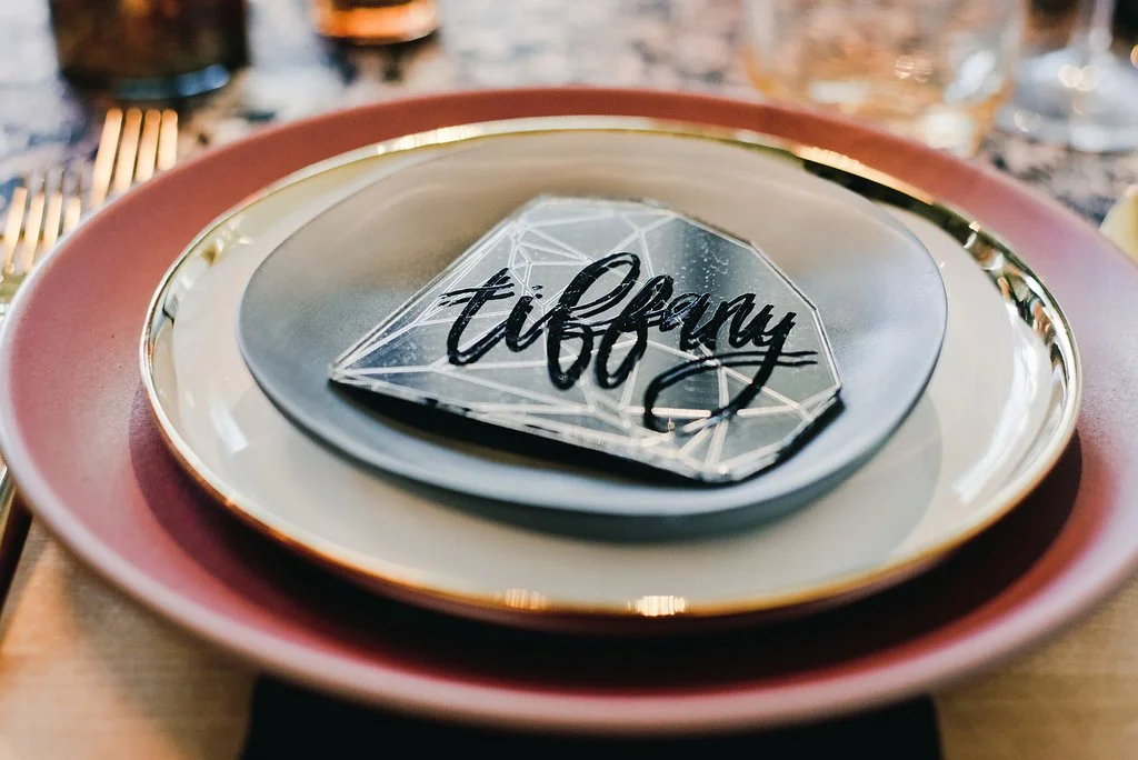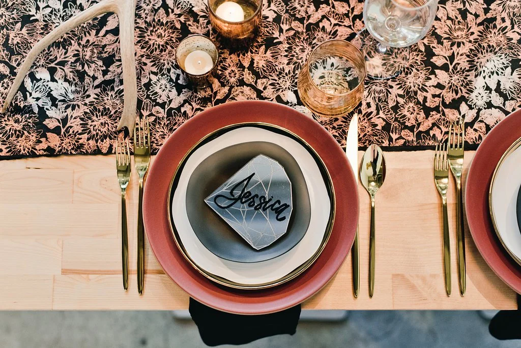 I hope this shoot inspires anyone planning a party to not be intimidated to go BIG on the details. I think that a tablescape that is well-thought out is one of the most important pieces of planning a perfect party. I really wanted to incorporate something that would make the table pop (but not in a gaudy way) and working with Angie (owner of Bobo Design Studio) was a dream. She came up with those gorgeous diamond-cut personalized name cards for each of the guests.