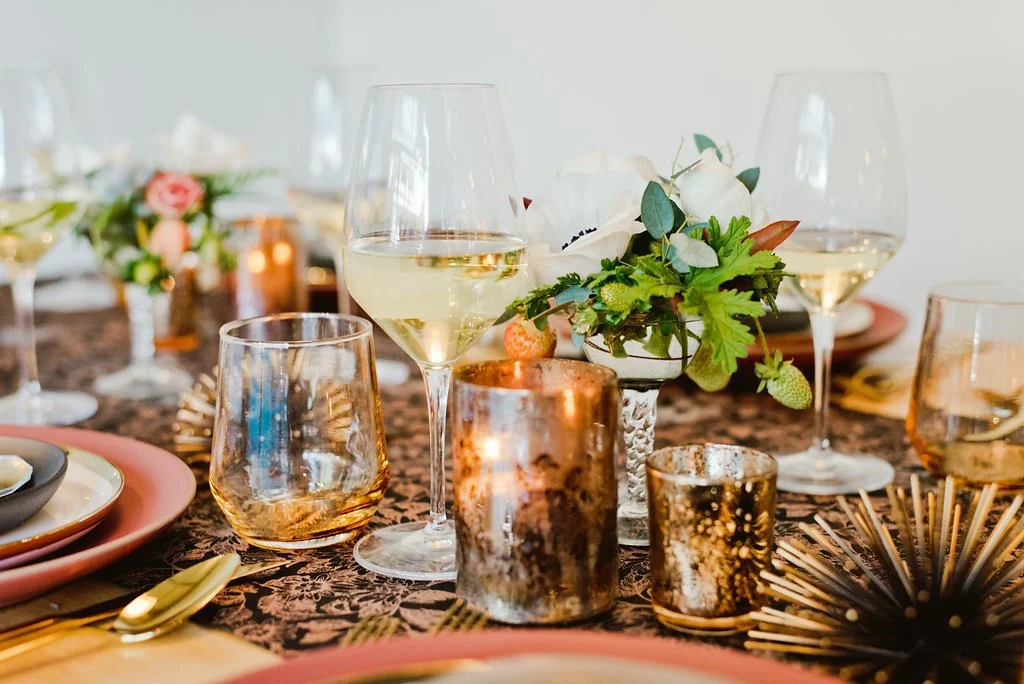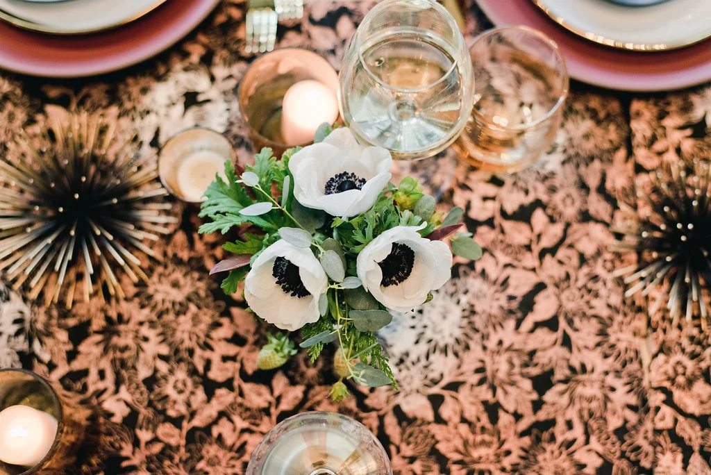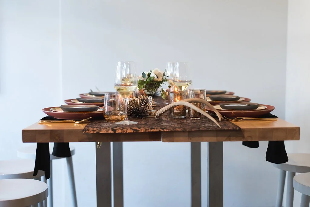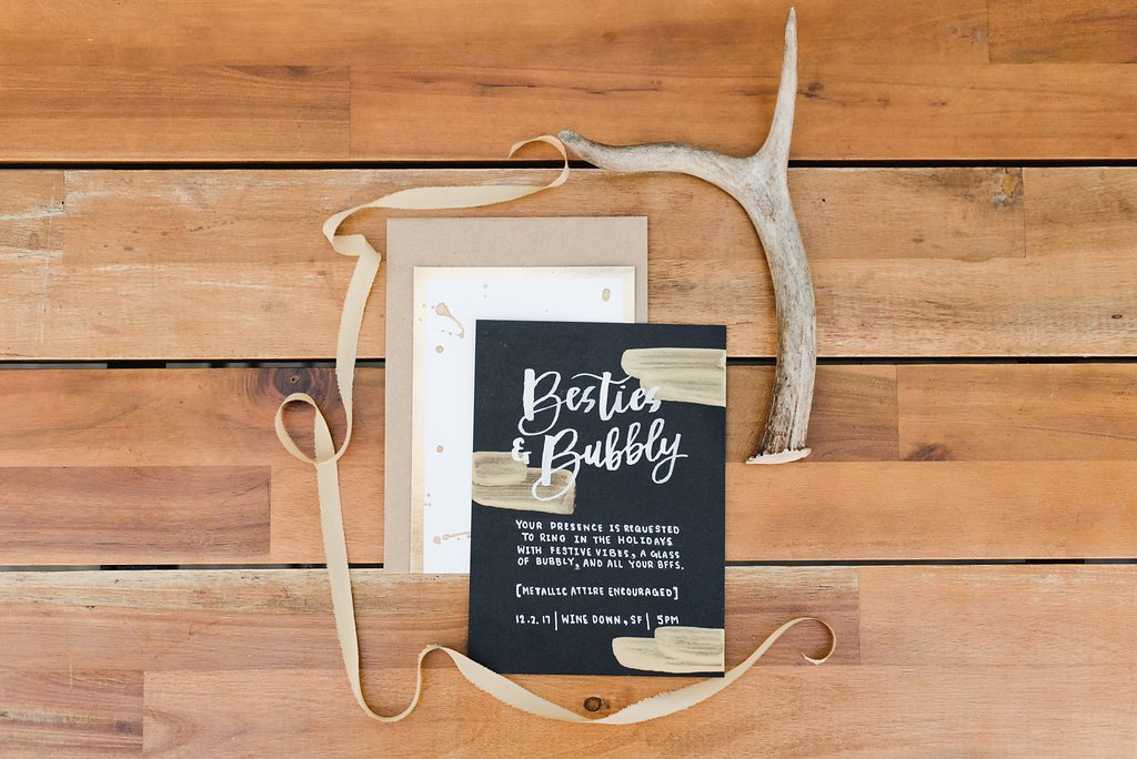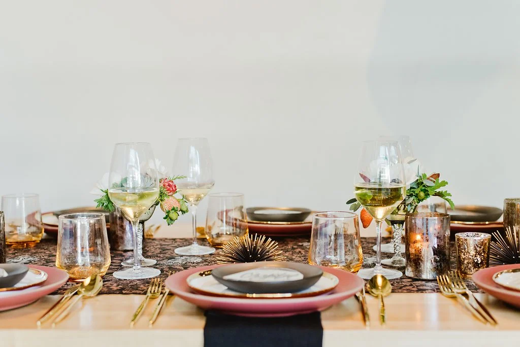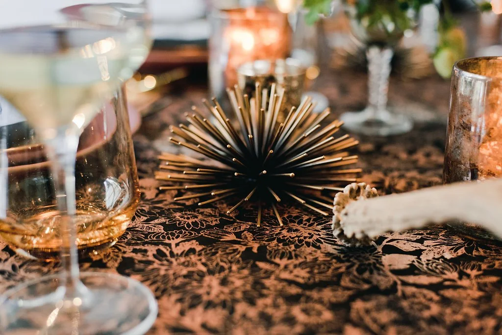 As we're all probably aware by now, metallics and velvets are taking over the fashion world for the fall and winter months, so that was where my initial inspiration came in. I wanted to play off the natural textures inside the bar, particularly the wood. There is something so inviting and warm about it. I decided to go with a bare tablescape, paired with a sleek black and gold runner from Lavish SF to keep things clean. My amazing friend and vendor, Angie of Chairs and Cups helped me conceptualize the perfect plateware/stemware set to make everything flow cohesively with the colors we had chosen. The best part was accenting this table with mercury votives, wooden antlers, and other odds and ends I sourced from Eileen (owner of Lost + Found Vintage Rentals).