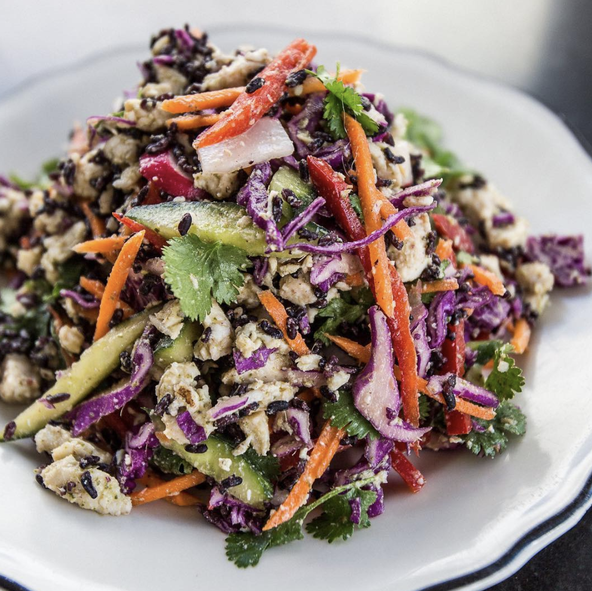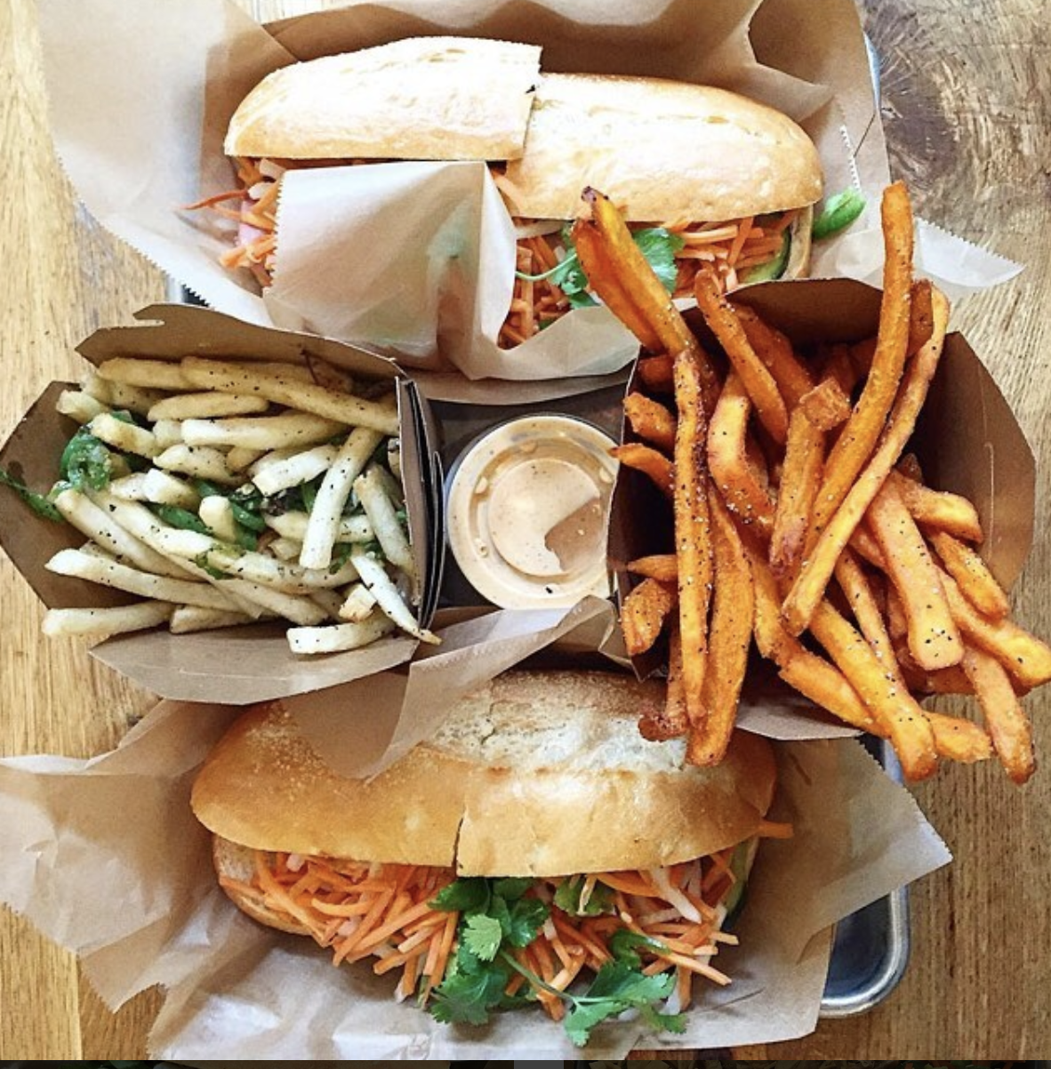 There are lots of vegetarian and even vegan options for rice bowls and takeout sandwiches at this casual Vietnamese spot. We’re partial to the smoky eggplant and crispy catfish sandwiches, or the hawker bowl if we feel like keeping our hands relatively clean, but there are always wet wipes if you don’t, or just greet people with a catfish handshake, maybe it will catch on.