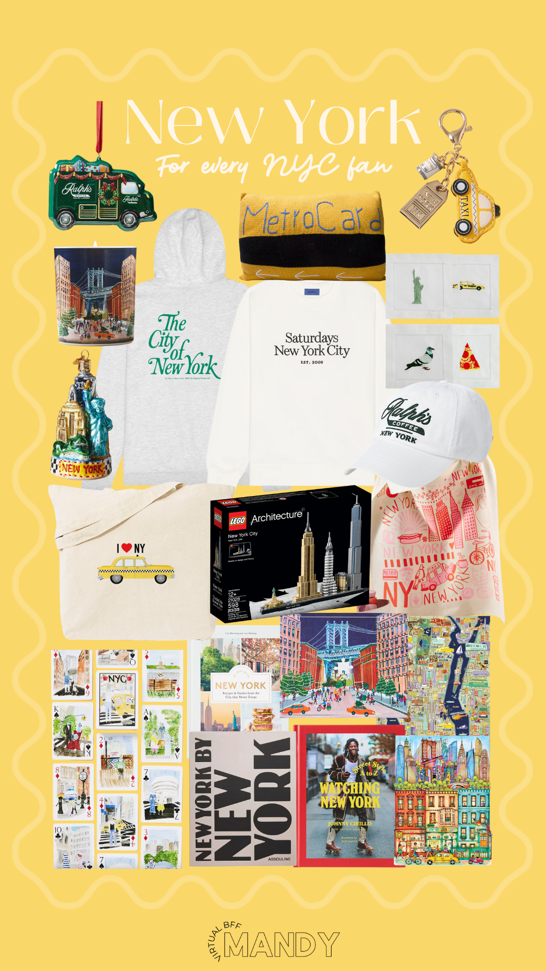 This gift guide has something for every NYC aficionado, whether they're locals who can’t imagine living anywhere else, or faraway fans with Manhattan on their mind. Think charming ornaments like a mini Ralph’s Coffee truck for the holiday tree, or a MetroCard beanie that’s basically a wearable souvenir. There’s also a LEGO Architecture set for building the NYC skyline, perfect for both kids and adults who appreciate the city's iconic structures.