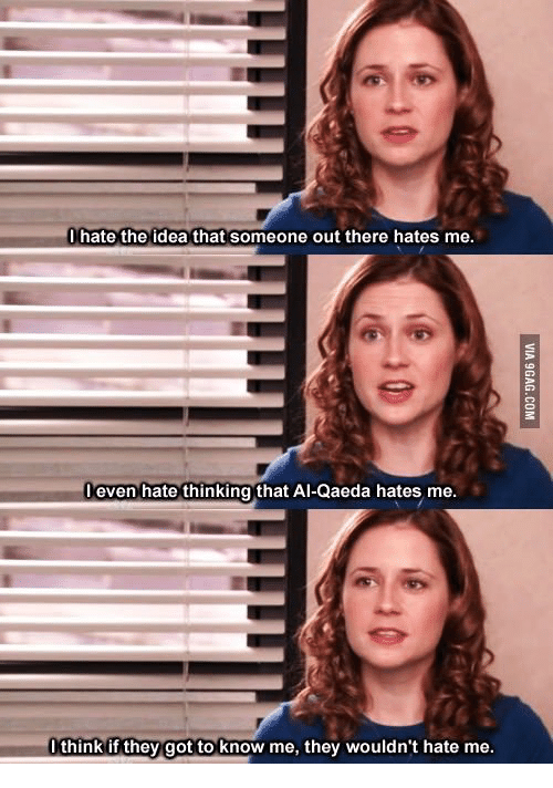 Any fans of The Office out there? Well, then you might remember that one season 5 episode when Pam accompanies Michael on a speaking tour to all the branches of Dunder Mifflin, including the one managed by Karen (AKA Jim’s ex-girlfriend). Pam knew she was the real reason Jim eventually broke up with Karen, so naturally she’s nervous AF. There’s a cutaway interview (don’t you just miss those?!) with Pam where she says, “I hate the idea that someone out there hates me.”
