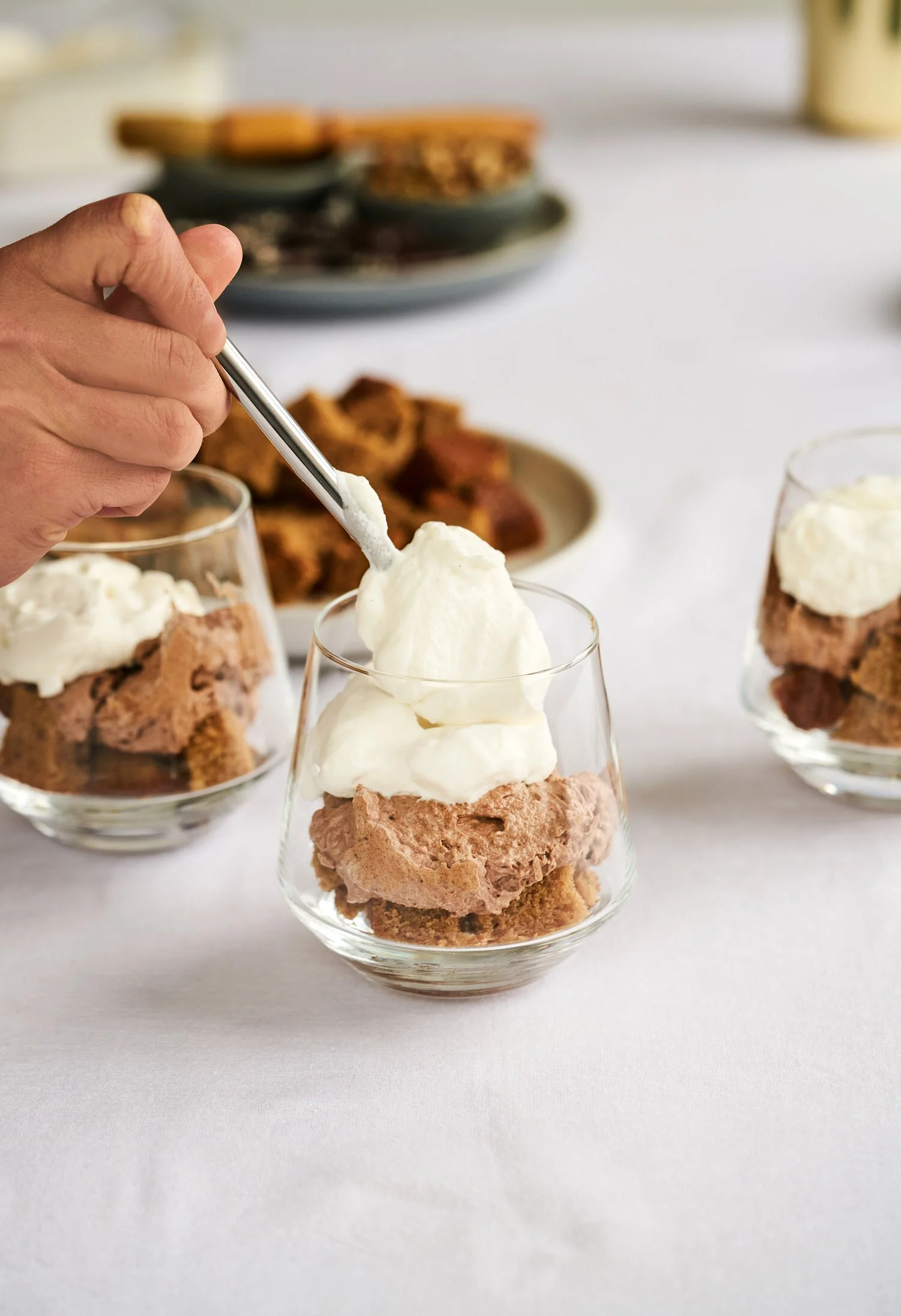2. To make the mouse: heat up ½ cup of the cream and dissolve the chocolate into it. Add the vanilla and instant coffee and stir. Beat the other ½ cup of cream to soft peaks, then fold in the other chocolate mix until combined.