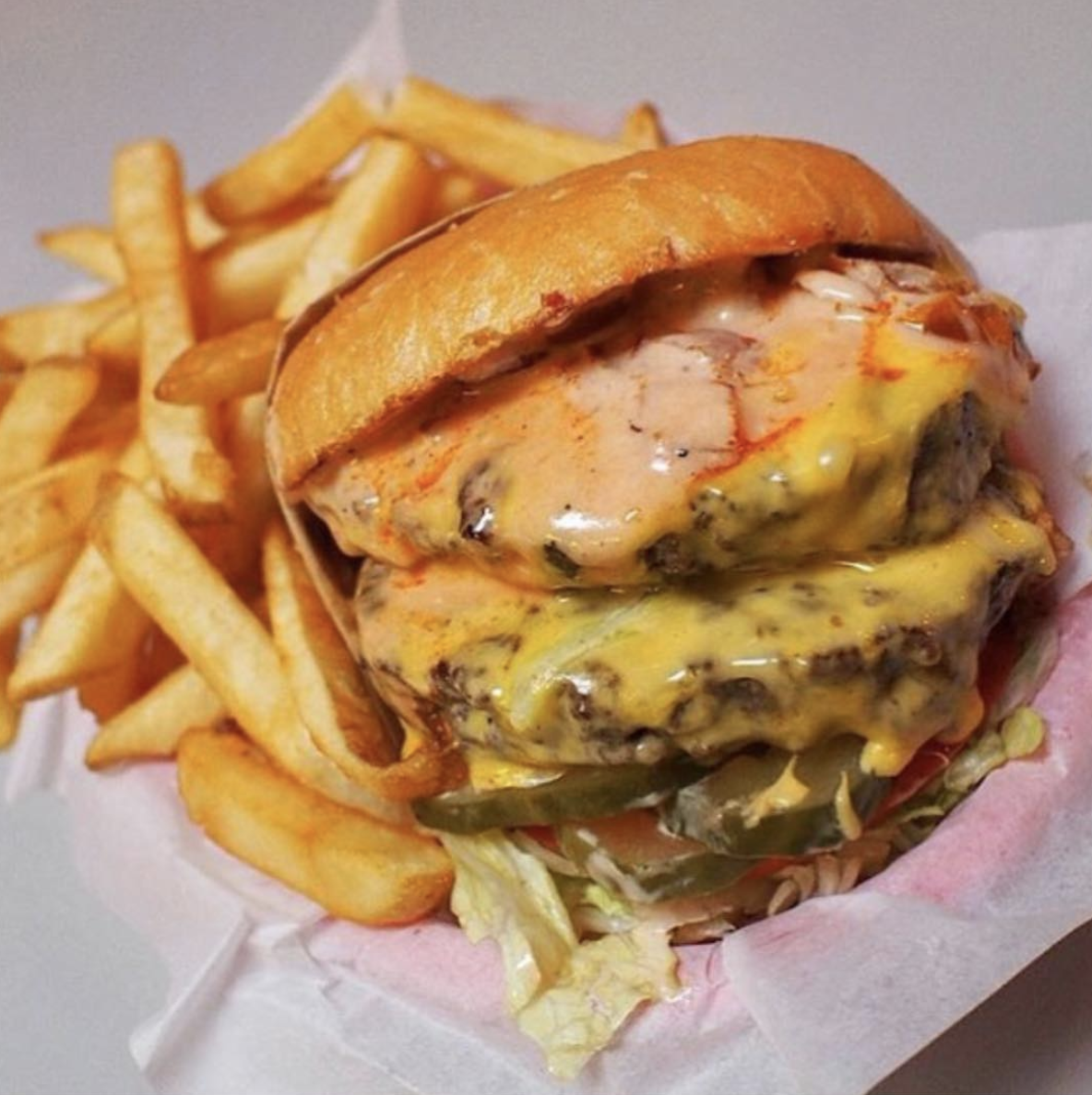Shredded lettuce, a big tomato slice, and melty American cheese make this essentially an upscale In-N-Out burger, and we mean that as compliment. You’ll want to complete the fast food journey by eating the mountain of McDonald’s-esque fries it comes with. Not that you needed us to tell you that.