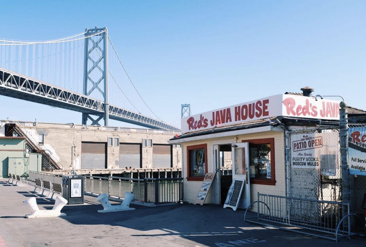 Regardless of the pedigree (or quality) of the burgers at Red's Java House, it's easy to see why a producer would want to get the place on TV. On a pier that juts out into the Bay, Red's looks like the tiniest of shacks from the outside. Inside, the long, narrow restaurant space sports an old-school menu board and vaguely off-color memorabilia (e.g., a mug shot of Patty Hearst). The concrete-floored seating area out the back has views out over the water—loading docks framed by the Bay Bridge.