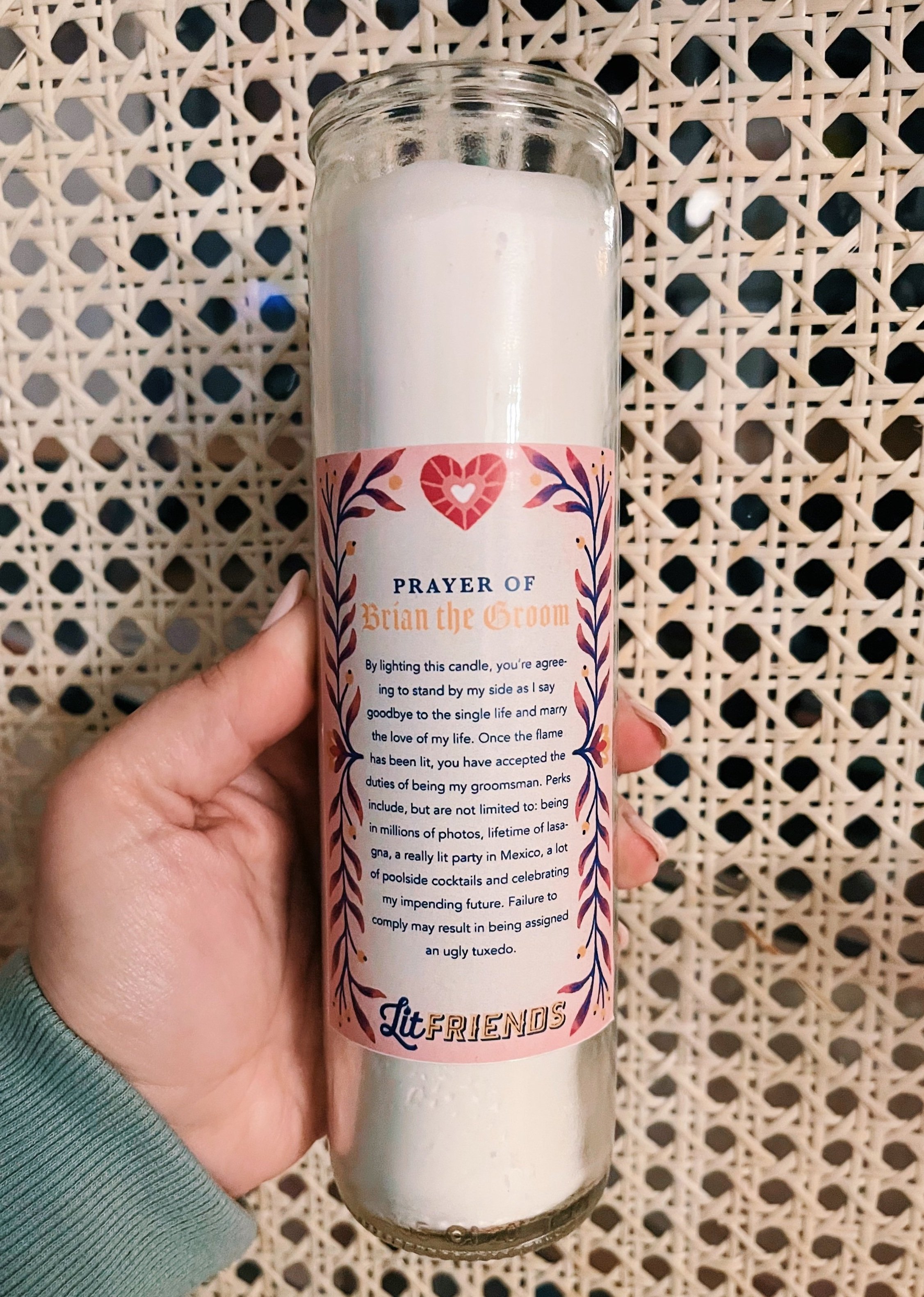 Not gonna lie, I low key had to twist my fiancés arm to send a proposal to his groomsmen. It took awhile for him to understand the concept. He didn’t get why he couldn’t just text them to ask, so we played into it with this witty card we found on Etsy. Then, I sealed the deal and got him super excited with these custom prayer candles. They were such a hilarious hit!
