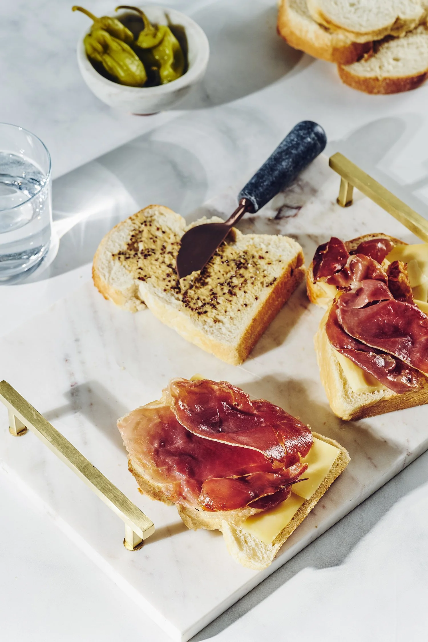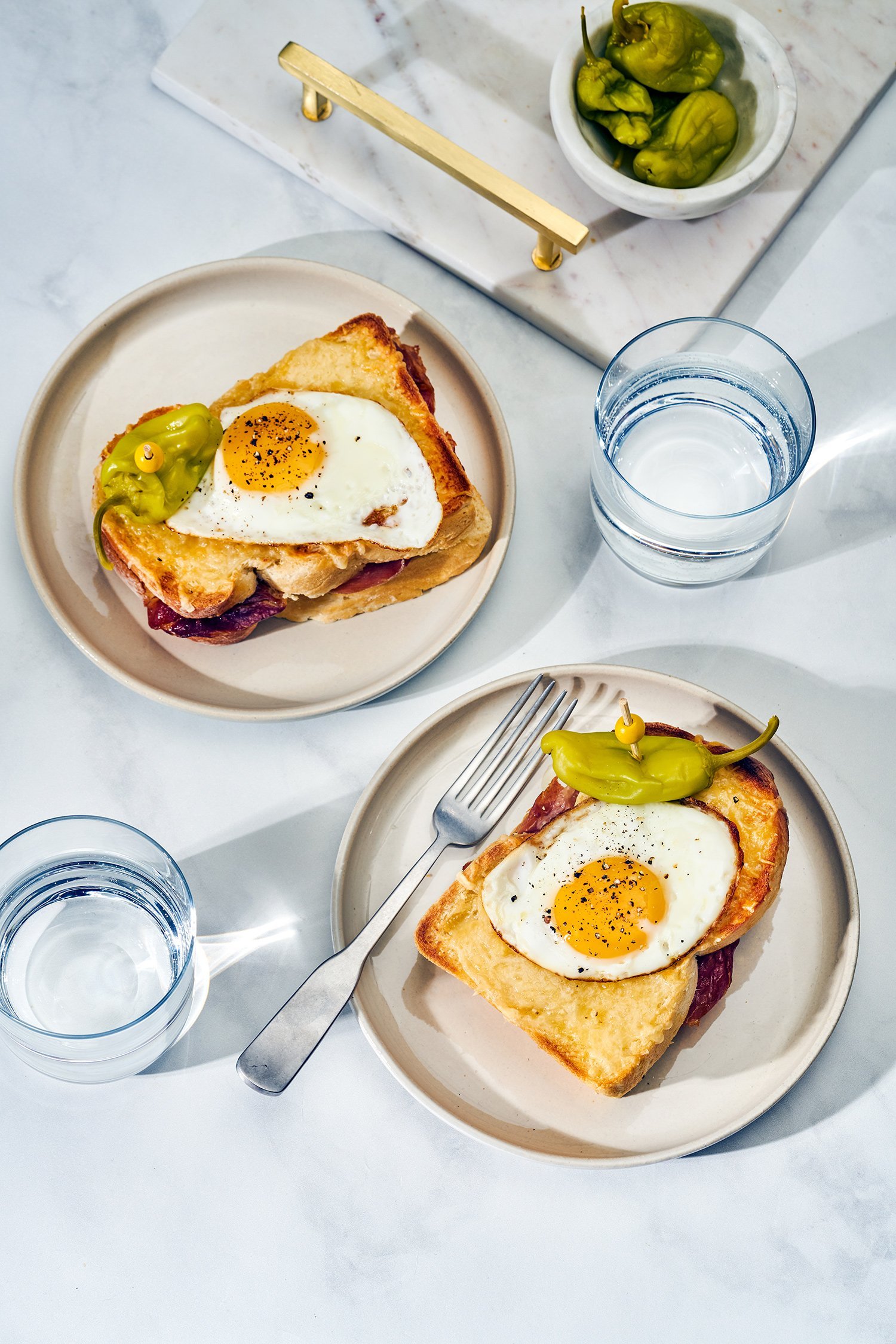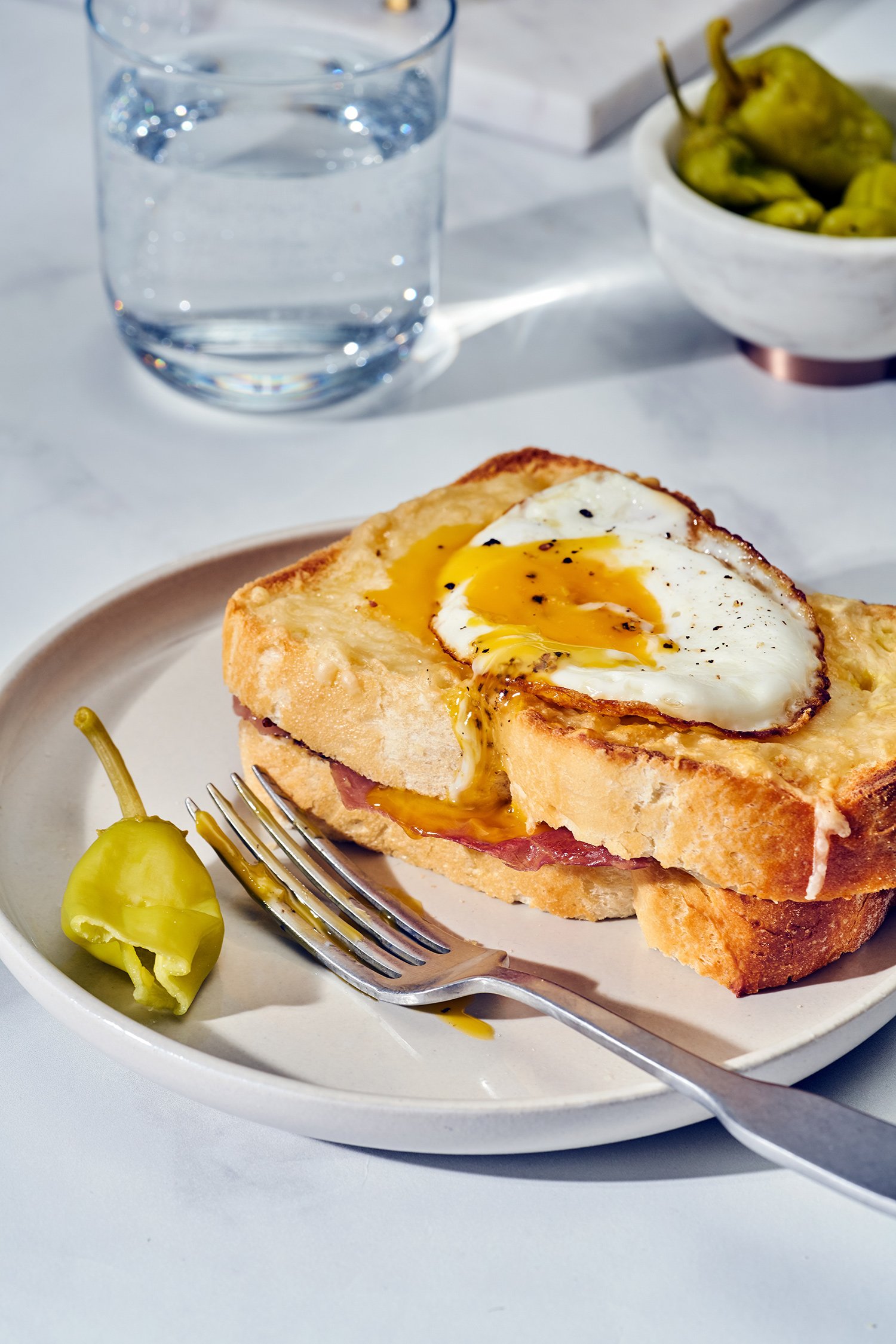 This French little classic number is a brunch-at-the-bistro staple that is super easy to make at home. For this recipe, I decided to leave behind the Bechamel sauce (which some people add to make it more decadent) and instead I made a little sweet-and-spicy mustard sauce. Cheese, crispy prosciutto, and a briny Hungarian pepper make it all come together.