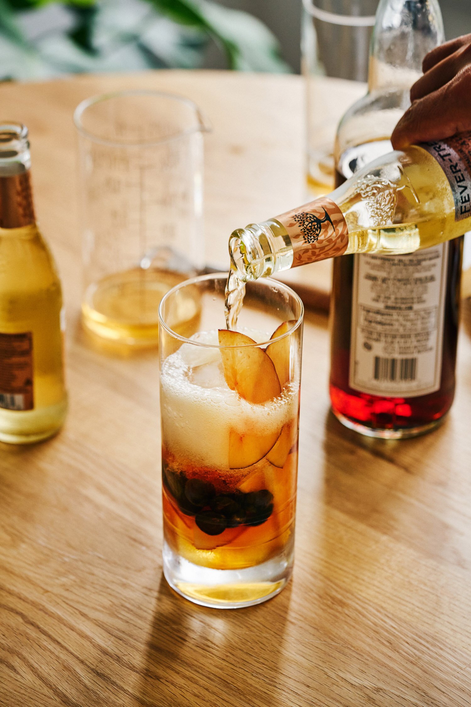 1. Place the Pimm’s, apple cider vinegar, and lemon juice in a cup, swirl to combine. Add ice, arrange the fruit around the ice and glass. Go for a major show stopping factor by layering the fruit by color
