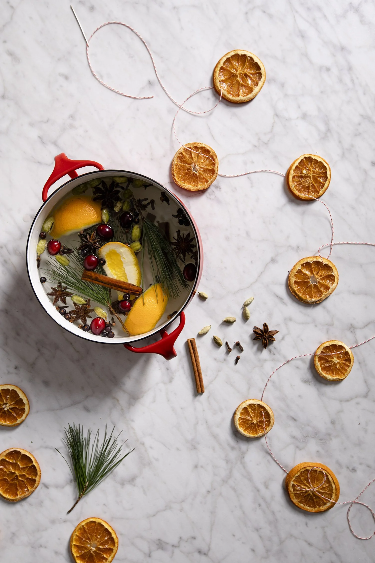 Make a homemade potpourri by adding pine branches, orange, nutmeg, cloves, cinnamon sticks and cranberries to a pot. Bring to a boil, then reduce to a simmer. Simmer uncovered for as long as you like, just remember to add water as needed so the pot doesn’t run dry.