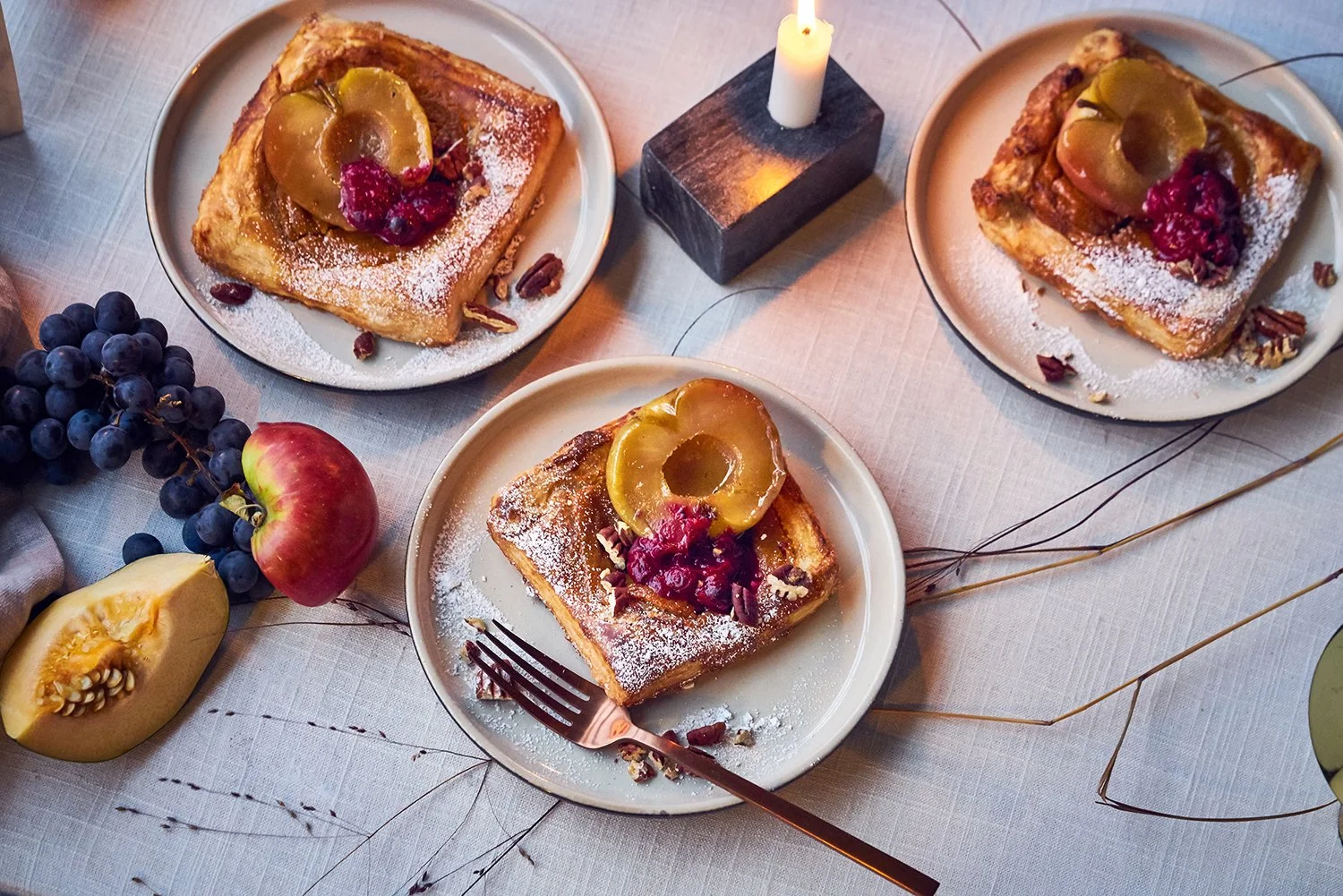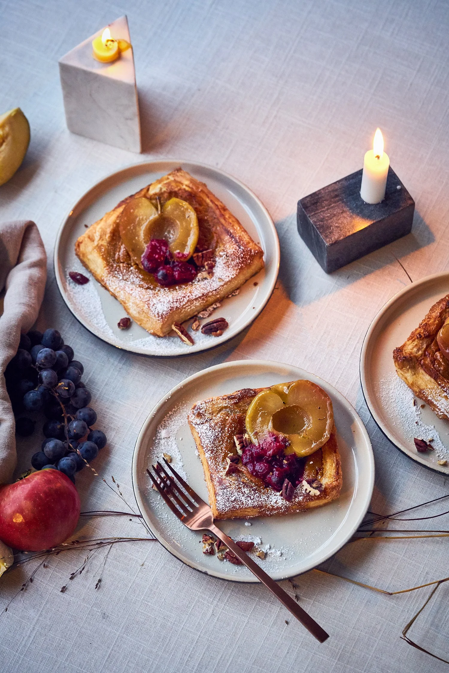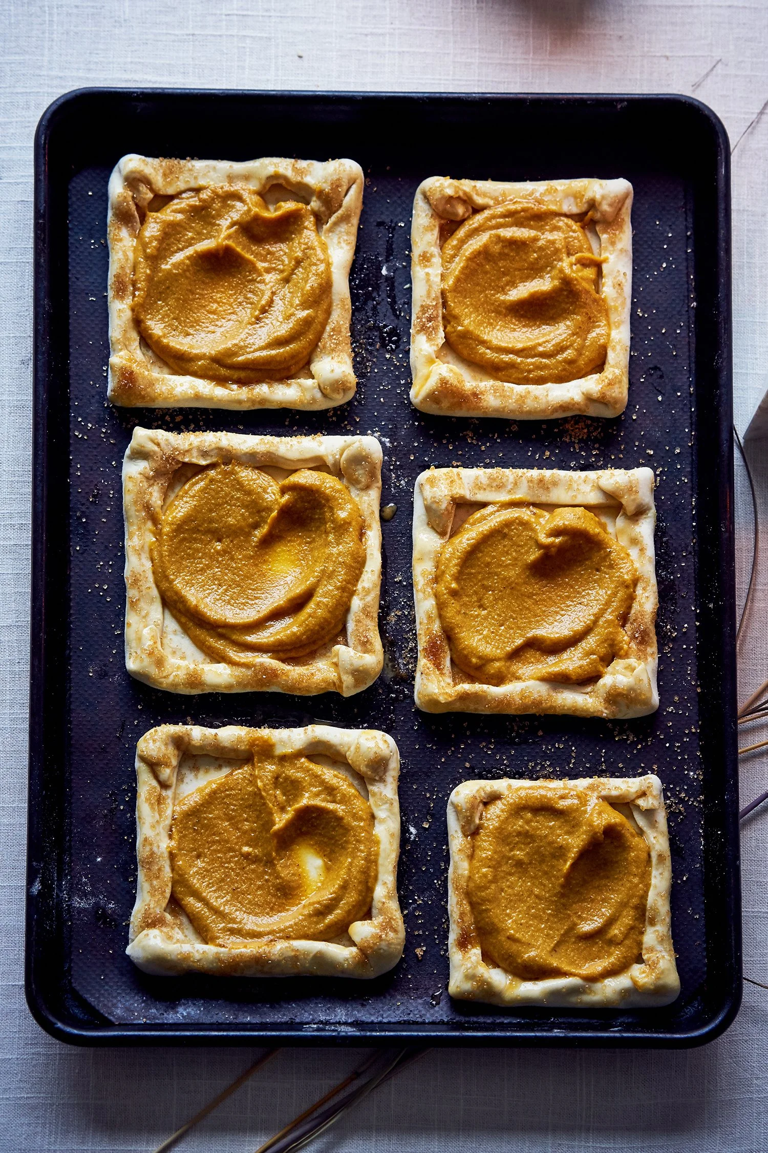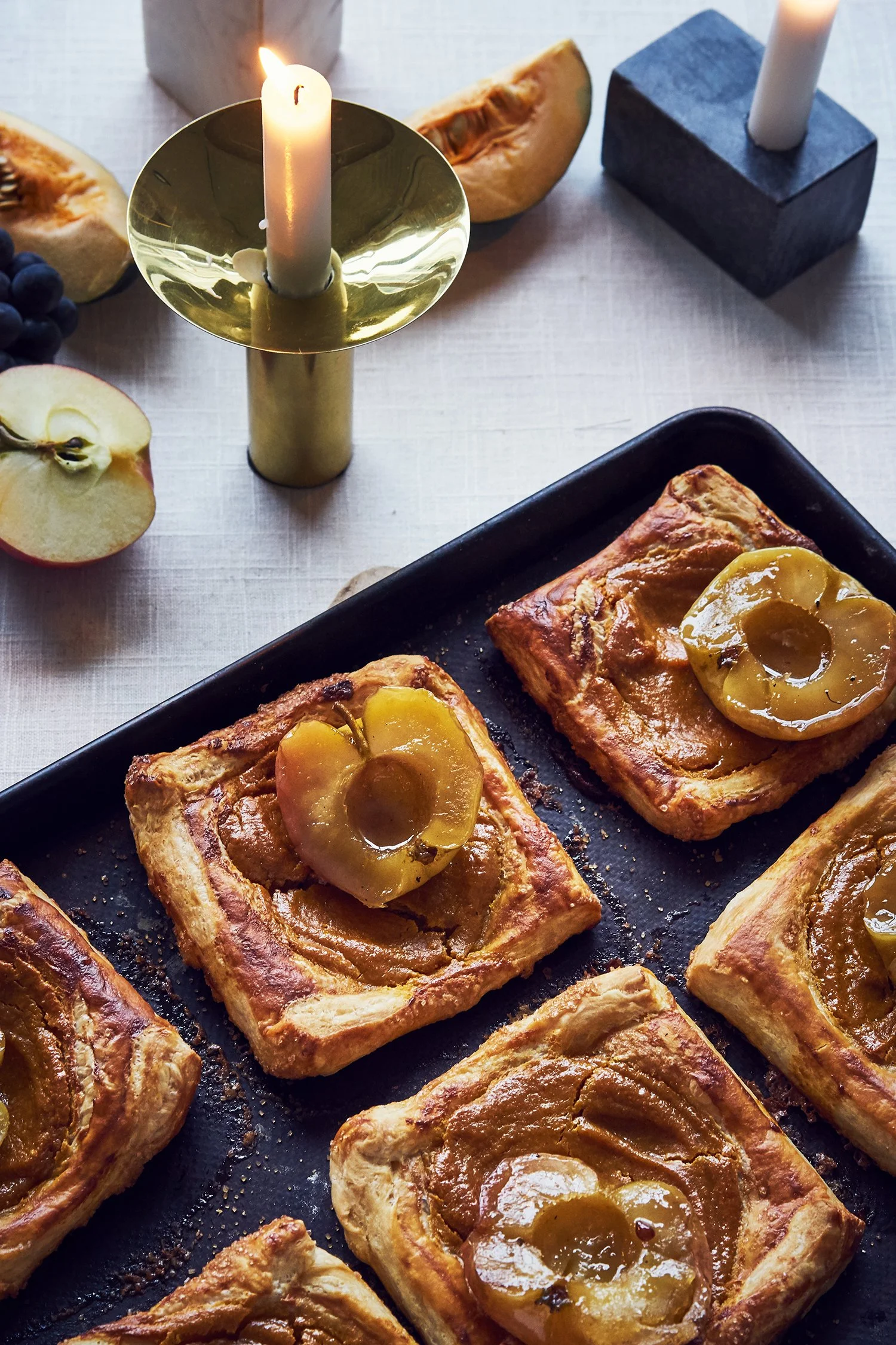 Are you all pumpkin-ed out yet? No? Good! Because I have one more treat you need to bake before we move on to the holiday season. This recipe is a bit of a hybrid between a mini galette and a Danish pastry (which have the centre filled with custard), the result is a crunchy buttery tart with a creamy pumpkin center, topped with a drunken apple — seriously good!