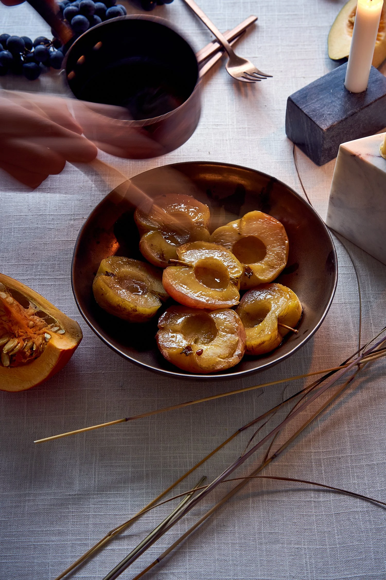 Thaw the pastry in the fridge for a couple hours. While the pastry is thawing, make the apples. Start by preheating the oven to 400F. Cut the apples in half and core them with a melon baller or spoon, mix the bourbon, brown sugar, and maple syrup then pour liquid into a small baking dish (small enough to fit the apples). Place the apples core side down onto the baking dish, break apart the butter with your fingers and scatter in pan. Bake the apples for 15-10 min until they turn slightly brown and they’re soft. Remove from the oven, take them out of the pan and save the liquid from the baking dish. Leave the oven on.