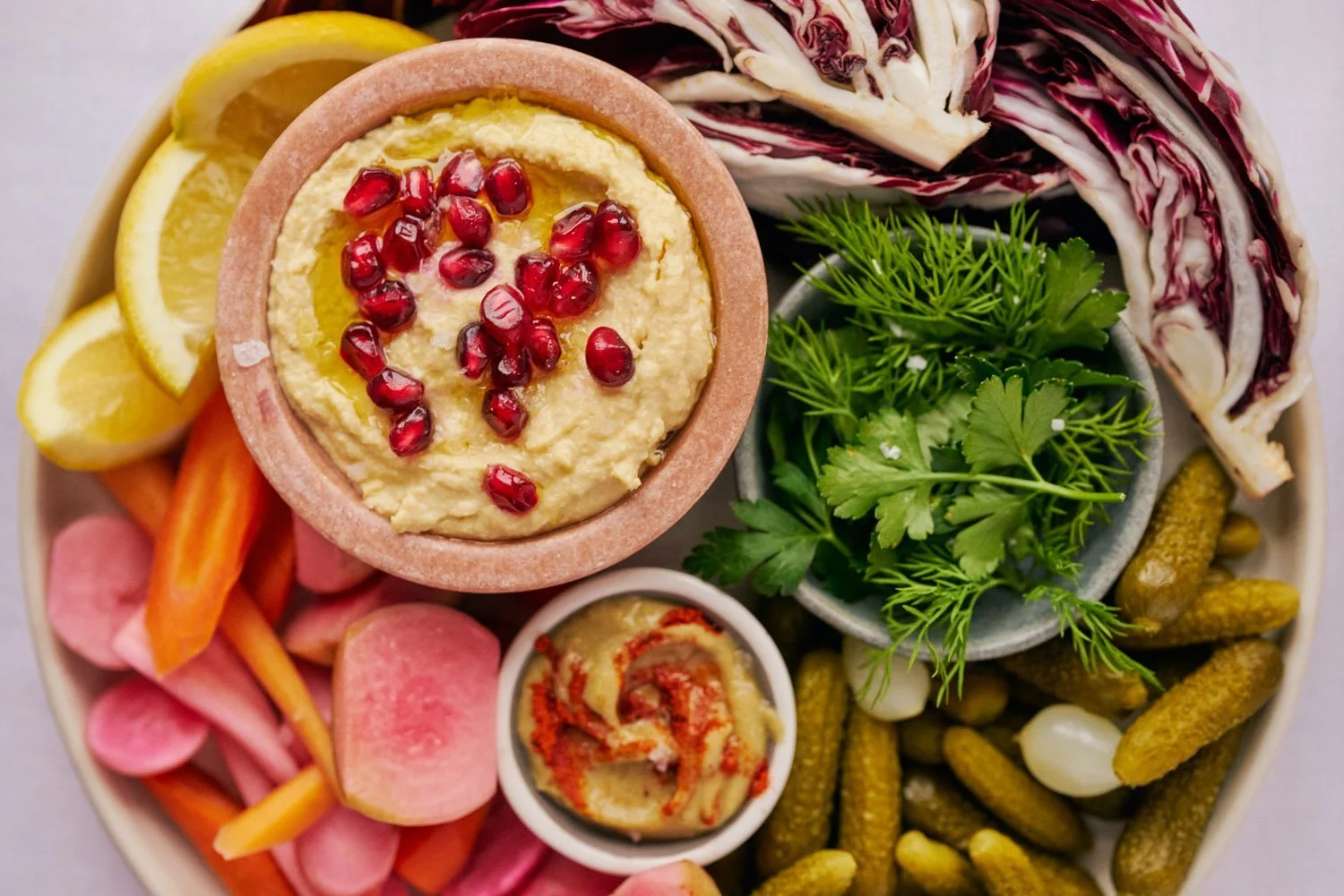 For this dip, I mixed up store-bought hummus (I love getting Mediterranean Hummus from Trader Joe’s) with roasted eggplants. It’s a baba ghanoush-hummus mash-up of sorts that’s super creamy and tasty. I like eggplant dip, but sometimes find it a bit too goopy, so mixing it with hummus makes it creamy without having to work extra hard in the kitchen. Add a sprinkle of pomegranate seeds or pine nuts in a little tablespoon pool of olive oil to garnish (my go-to way to make things feel fancier than they are) and you’re done.