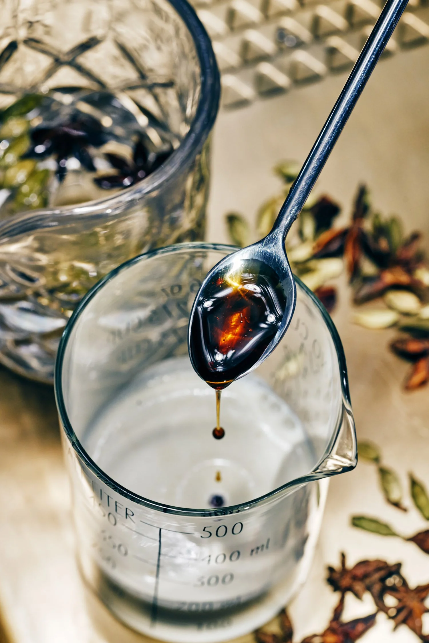 1. Place all of the vodka infusion ingredients together in a beaker with a lid or on a glass container. Cover and let the vodka infuse overnight or for a full day. After it’s infused, strain and set aside.