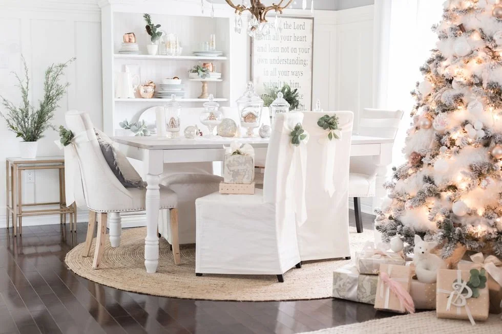 This dining area by Craftberry Bush allows the fabulous tree to be the room's focal point, while incorporating hints of greenery throughout the all-white space. Glam and functional.