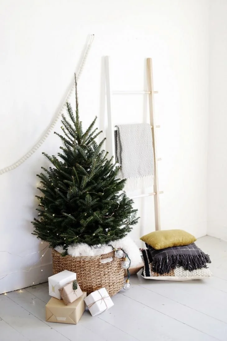 Keep it small and simple with an adorable mini holiday tree, like this set-up from The Merrythought. Ideal for rooms lacking in square footage, keep the surrounding decor Scandi-chic with neutral colors (yes, even presents!), a few cozy blankets, and the daintiest of fairy lights.