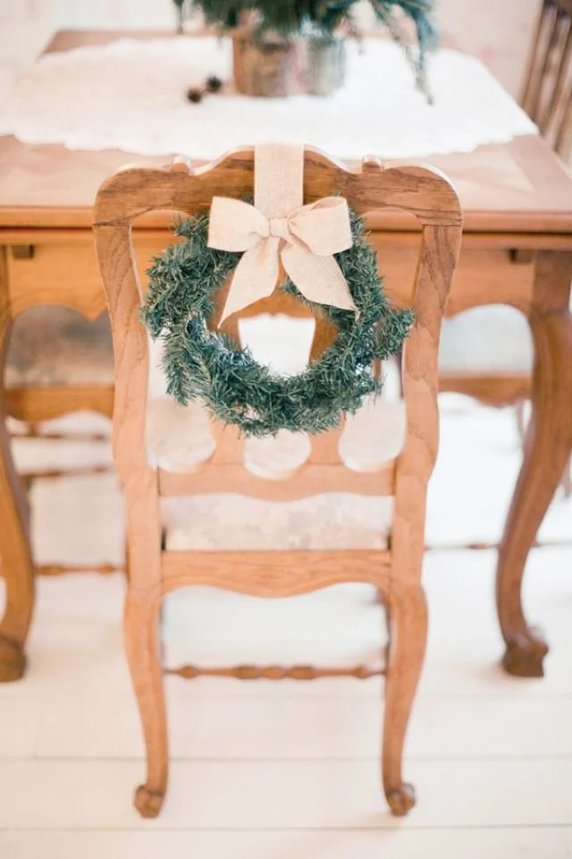 Jazz up your everyday furniture with Christmas flair without taking up any extra space. In this festive vignette, Burnett's Boards adds a a sweet touch to wooden dining room chairs with a small wreath and neutral ribbon.