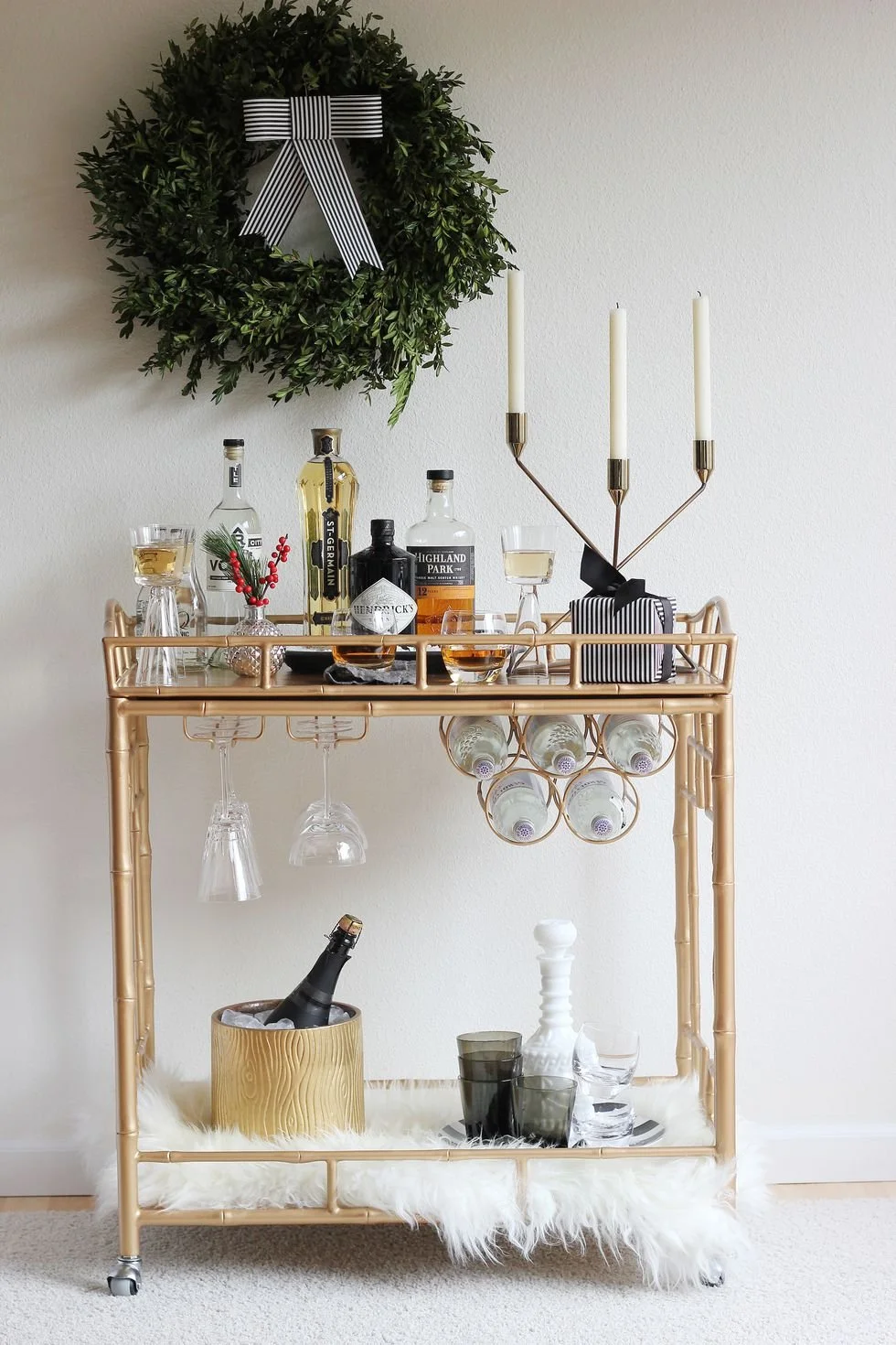 If there's one holiday vignette your guests will all gather around at a Christmas party, it's the wine and spirits. Take inspiration from Hank & Hunt and decorate your bar cart with faux fur, cranberries, whimsical candlesticks and a wreath.