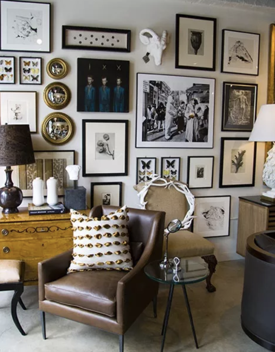 The mixed mediums create a great layered sense of texture on the wall, and we love that the gallery is floor-to-ceiling and incorporates the furniture so it flows seamlessly with the room. Last tip for a room like this? You'll want to pull out a level for this one. Making sure that every frame is perfectly straight is crucial to providing a sense of structure.