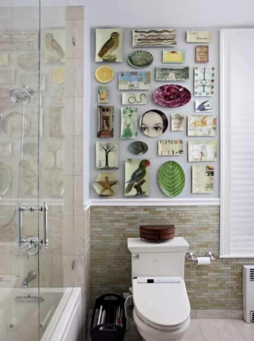 Look closely at this wall? What do you see? Not a single one of these pieces is a painting or a photo. In fact, they are all serving platters. Who can turn down a great deal on a beautiful, unique serving dish, a ring bowl, or mismatched vintage china? We can’t! Unfortunately, unless you are entertaining very often, most of those beautiful pieces rarely see the light beyond the cupboards. But they can create a truly memorable gallery wall. We like that this gallery wall is in the bathroom for two reasons: First, the bathroom is often sorely neglected when it comes to design; and second, there’s not a lot of gregarious activity in the bathroom (think: impromptu kitchen dance party) that would make a gallery wall made of breakables especially vulnerable. But what we like most is that this is a truly creative use of unusual pieces in a space where you don't usually see gallery walls. When planning your next wall-based masterpiece, look for opportunities to think outside the box. You'll be amazed by what you come up with.