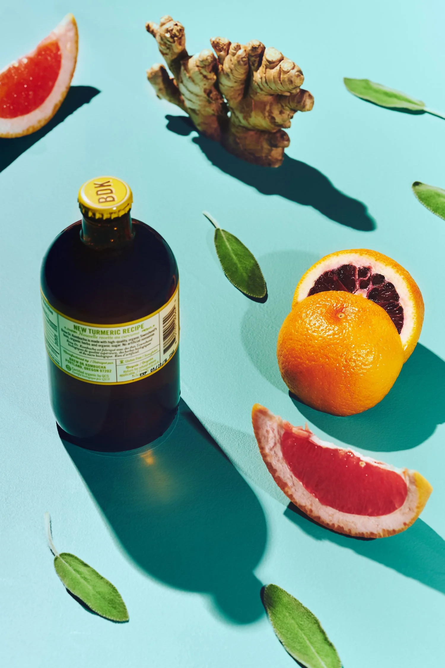 To serve, add about 1 tbsp of the infused ginger juice into a glass, then add about a ¼ cup of grapefruit juice, 1 or 2 tablespoons of blood orange juice, and top with kombucha to fill the glass. Garnish with sage leaves and drink immediately. Repeat the same process for all glasses.