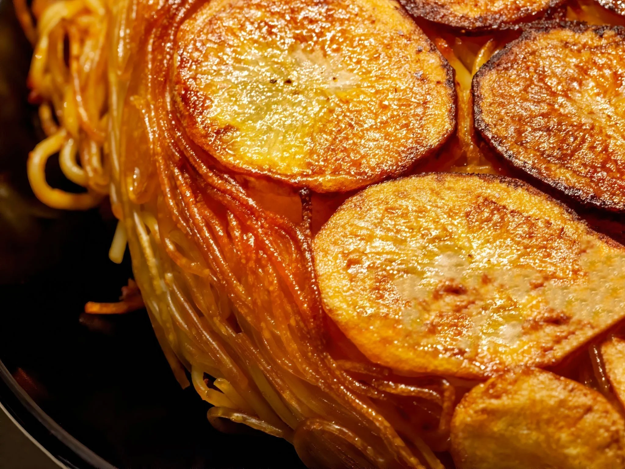 Decrease heat to low, cover the lid and cook for 45 minutes. After 45 minutes, stir the spaghetti and serve. You can check with a spatula or spoon to make sure they potatoes have some crisp to them. You’ll then be able to get to the bottom of the pot (Tahdig literally mean bottom of the pot) to serve yourself and your guests a crispy potato alongside your Iranian Spaghetti.