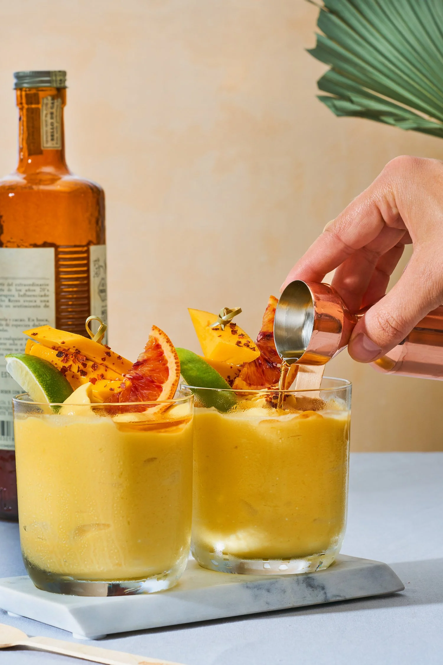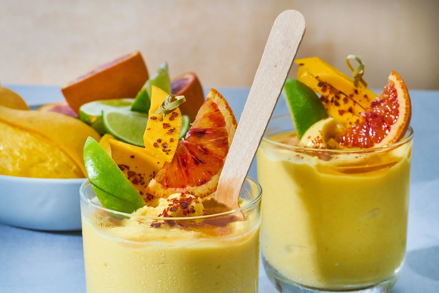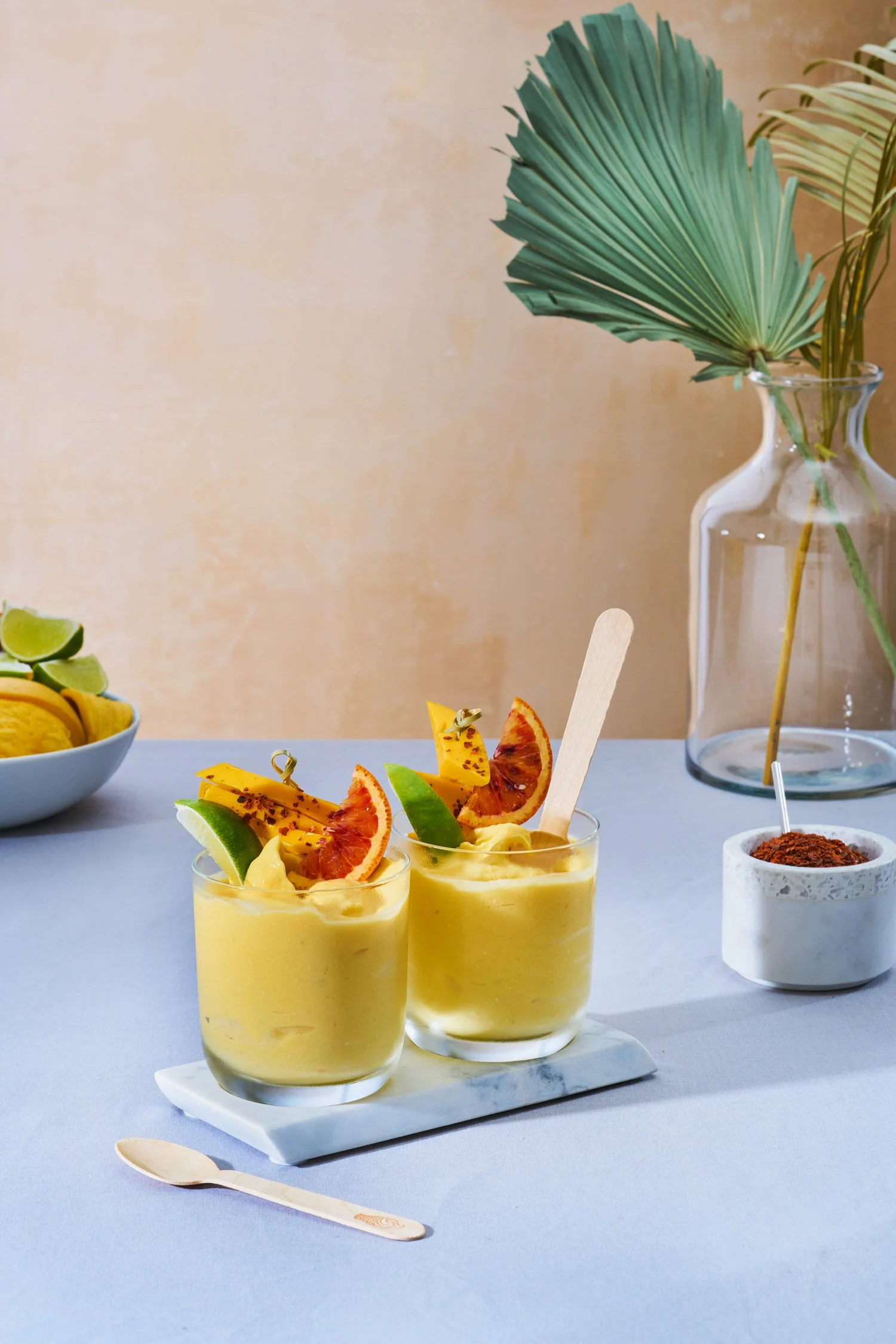 – For the garnish: fresh mango, blood orange wedges, lime wedges, chile flakes