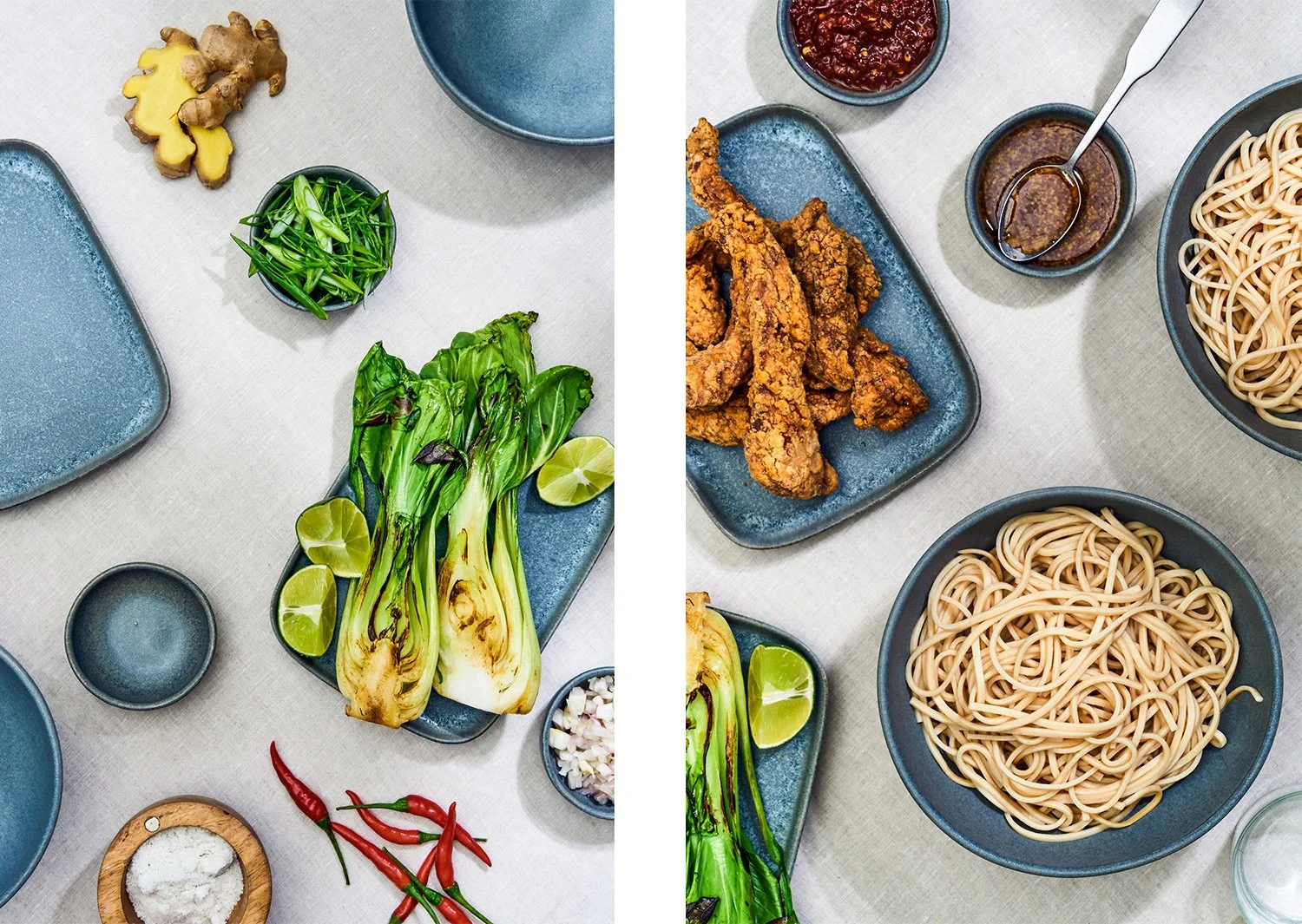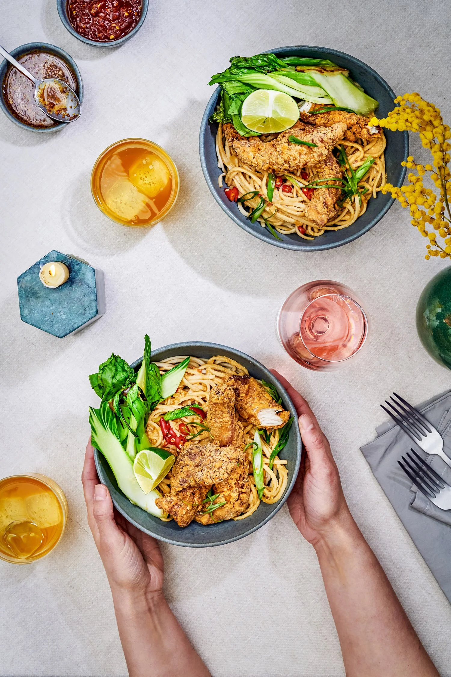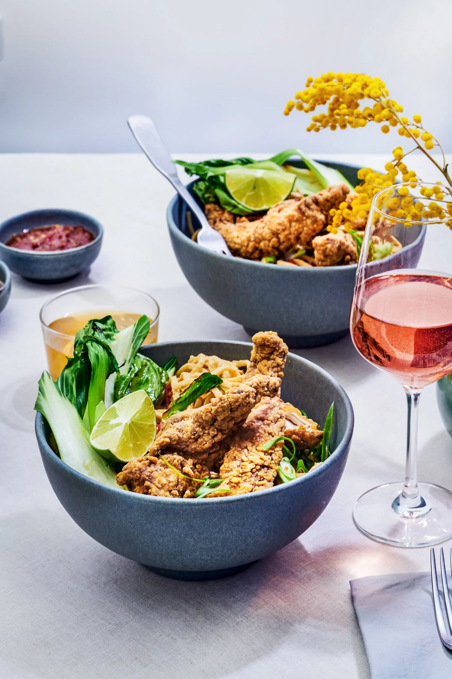 4. Grab a bowl and toss the cooked noodles in the sauce, then serve them on your plate. Top with fried chicken, sauteed bok choy, green onions, chilies, lime wedges and any sauces you’d like.
