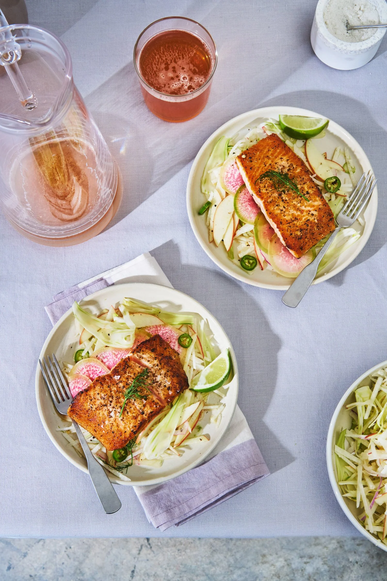 Salmon with Apple + Fennel Slaw with Aguachile Dressing