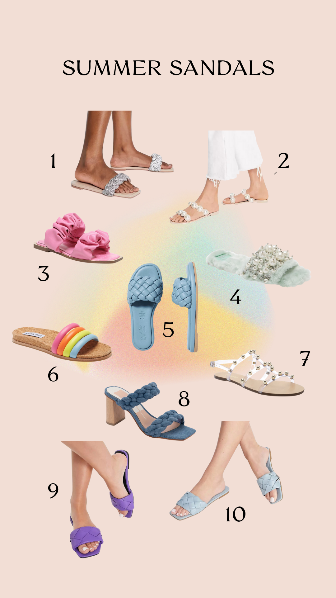 Summer is here and it’s time to slide into some cute sandals and let our toes be free. There are so many cute trends to step into this summer and so many beautiful hues to play with. Here are my favorites for summer sandals. Cheers to summertime and sunshine.