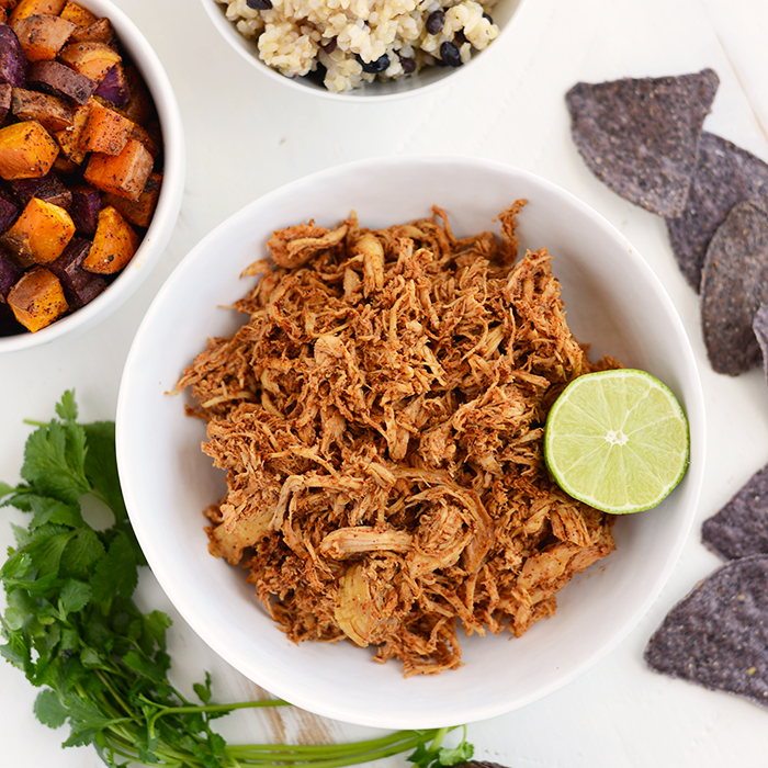 Remove lid from slow cooker and shred the chicken with two forks. Ta-da! The chicken is ready to serve!
