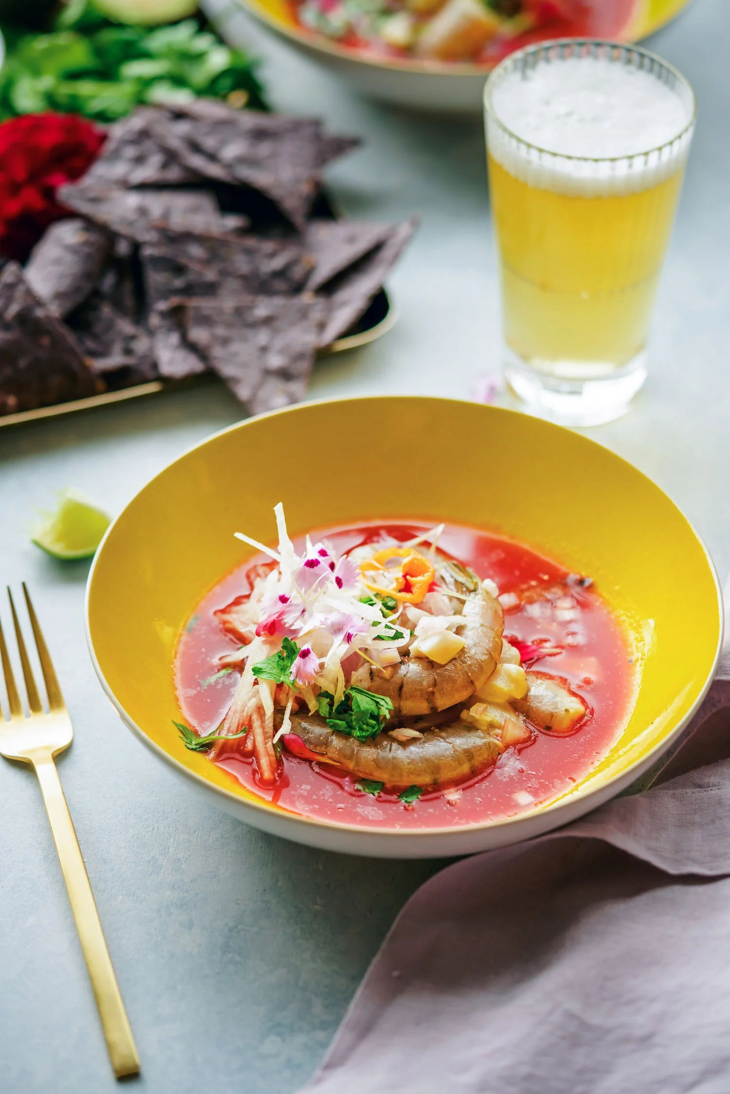 This version of ceviche is a bit of a mix between the classic recipe and aguachile, which is a different kind of ceviche from the northern states in Mexico (aguachile is quite hip right now). The main difference is that it uses fresh water shrimp and habanero and it’s served in more of the curing liquid.