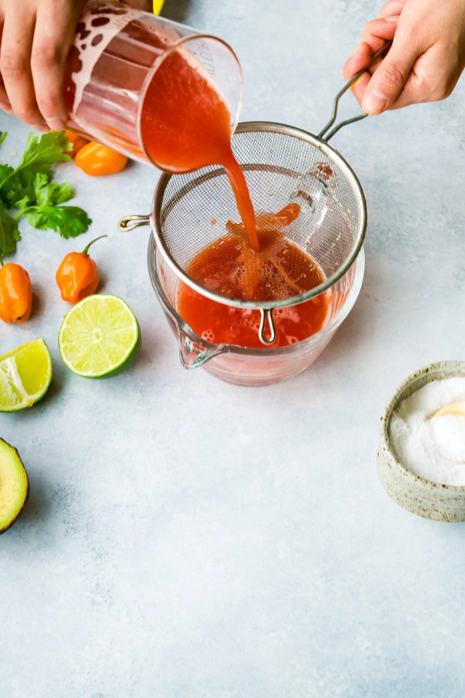 2. Combine all of the ceviche ingredients and put in a small bowl. Cover with plastic wrap and let it sit in the fridge for 2-3 hours. After this time, take out the cured fish (discard liquid) and place the strained fish in the bowl with the watermelon brine, let it sit for another hour.